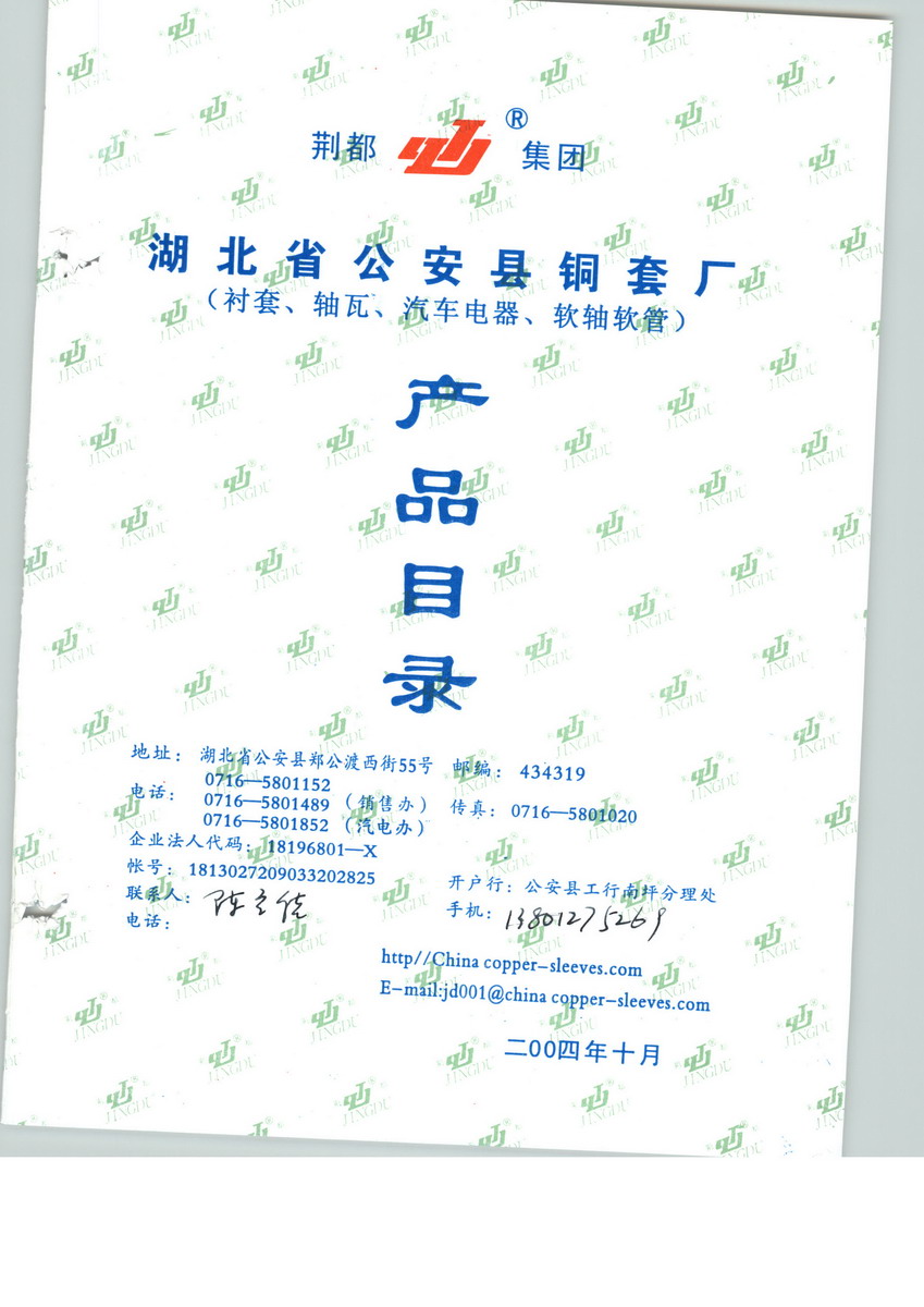 湖北省公安县铜套有限公司创建于1984年10月,是一家汽车零配件的专业生产厂家。企业生产的“荆都牌”系列产品,主要有汽车衬套、汽车轴瓦、汽车拉线、汽车导向器等。产品采用国际标准生产,并通过了TS16949质量管理体系认证。质量处于国内领先水平,并先后与东风公司相关厂、玉柴机器、江淮汽车、通用五菱、长城汽车、九鼎科技等国内大型主机厂配套。