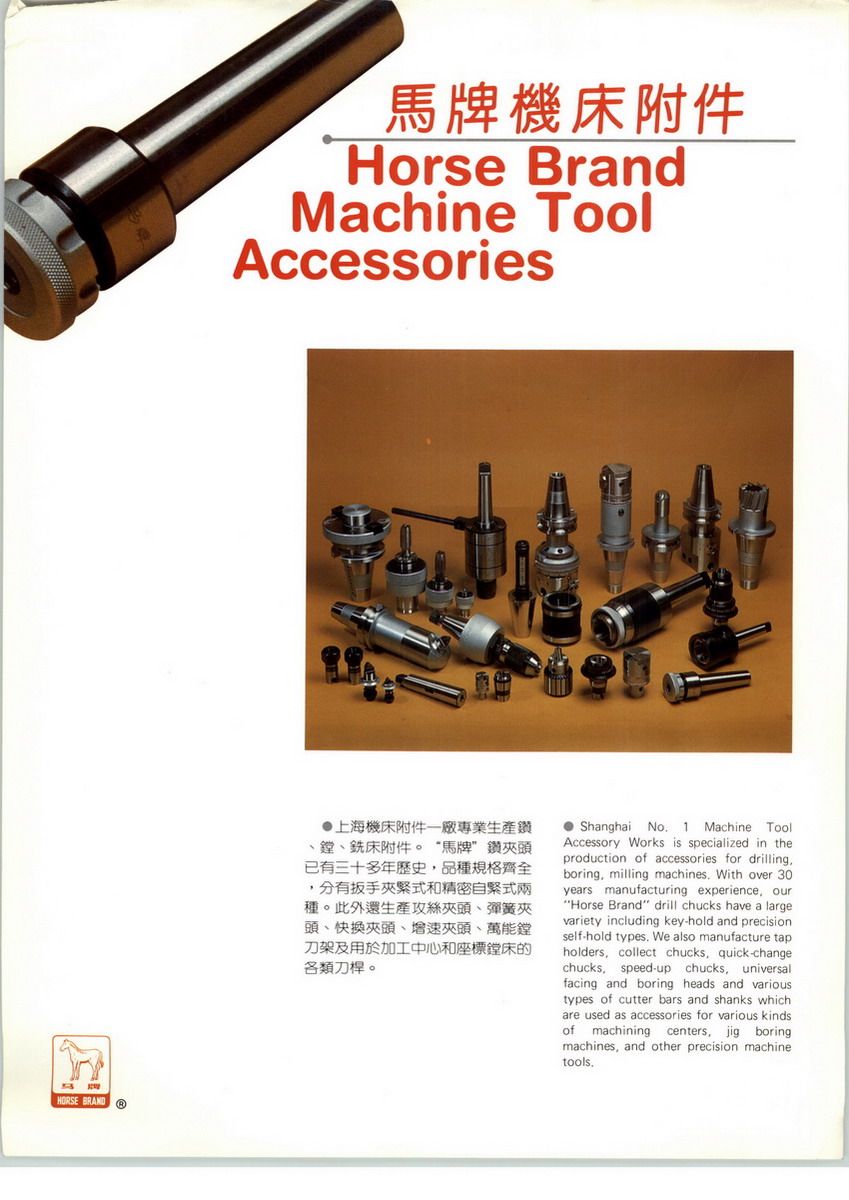 公司继承和发扬了“马牌”开拓求精、诚实奋进的精神,致力提升产品质量与服务,主要产品有“马牌”钻夹头、攻丝夹头、快换夹头、弹性夹套、XT/BT/JT/ST数控刀柄、回转顶尖、莫氏变径套、莫氏接杆,加长变径套等。为上海工具厂附件类优质生产基地。