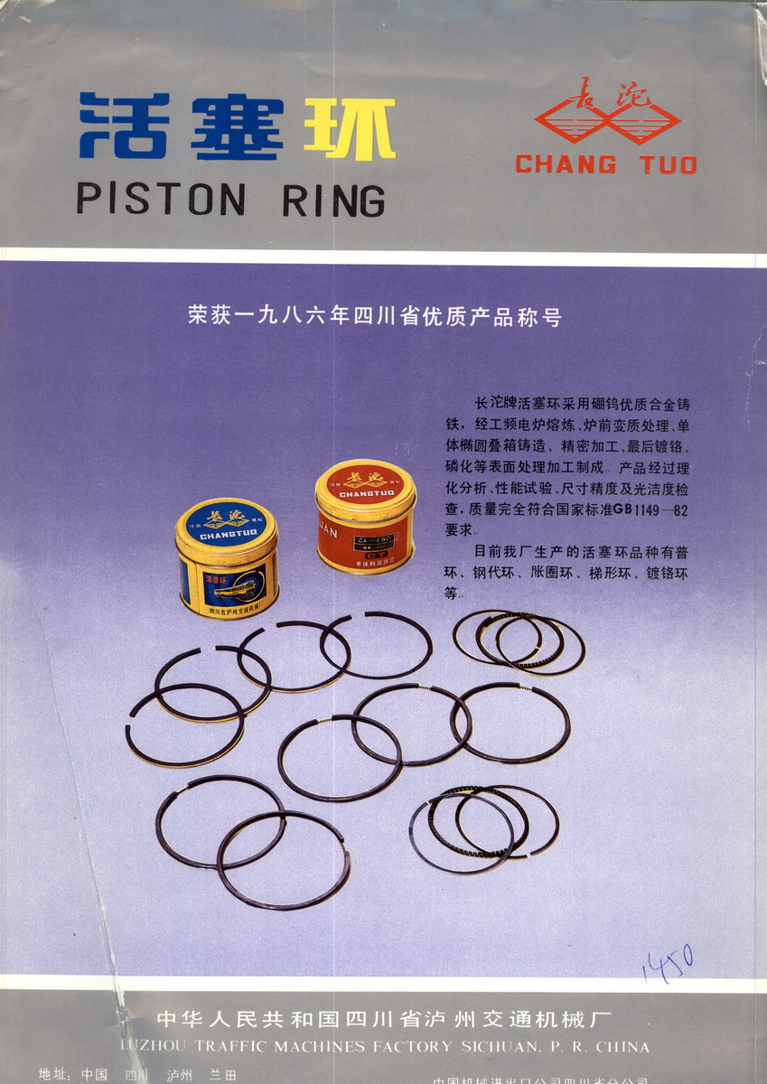 “信誉”是我们合作的宗旨。“质量”是我们联系的桥梁。四川省泸州交通机械厂地处国家历史名城,国家十佳卫生城市之一──泸州,座落于兰田镇,西距泸州机场三公里,北以泸州长江大桥为连接线距市区四公里,川滇公路国道从厂门前穿过,交通便捷,整个工厂处于水、陆、空立体运输网络的紧密联系之中。该厂兴建于一九五零年,系国家交通行业定点生产汽车配件的重点厂家,是中国500家最大交通运输设备制造业企业之一,是中国汽车工业协会成员厂,东风汽车工业集团公司成员厂,现有职工2000人,其中各类专业技术人员300余人。工厂占地面积11.6万平方米,拥有固定1.39亿元,属国营大中型骨干企业。共有各类设备500余台(套),近年又从日本、瑞士等国引进活塞环加工专用设备和检测仪器8台,使活塞环生产技术日臻完善,产品档次不断提高。主要产品有内燃机活塞环、活塞、汽车后桥半轴、半轴套管、飞轮齿环五大系列;并且向用户提供活塞环、活塞、汽缸套、活塞销四配套组合件及总成。其中,进口车型产品占一半以上,均达一等品水平。近年来,该厂产品继荣获部、省双优称号之后又连续获得“全国首批汽车零配件‘推荐商品’”和中国名牌产品认定暨明星企业评选活动组织委员会认定的“中国名牌品”。该厂“长沱”牌活塞环系列产品均采用硼钨优质合金铸铁、球墨铸铁,经工频电炉熔炼,炉前调质处理,单体椭园叠箱铸造,精密加工,镀铬,磷化,氧化等表面处理加工制成,产品经过理化分析、性能试验、尺寸精度及光洁度检查,质量完全符合国家标准gb1149-82要求。“长沱”牌后桥半轴采用优质40cr 合金结构钢材料,经过锻压、机械加工、热处理和表面处理加工而成,各项性能指标均符合gb1149-82要求,使用寿命在十二万公里以上,是用户多年以来极其信赖的产品。飞轮齿环选用优质碳素结构钢,其化学成分及物理性能指标均符合gb697-65标准和美国astm标准;经滚轧扩孔,精密液压,滚齿机加工,高频感应,淬火热处理加工而成。可根据用户要求采用其它钢号材料进行渗碳硬化处理;并且,可生产英制、公制二种模数,不同压力角,不同变位系数的飞轮齿圈,产品一直深受用户的欢迎。四川省泸州交通机械厂经过四十九年的拼搏努力,凭着“一定要制造出自己的名牌”的坚韧不拔的精神,以严谨的科学态度,大搞新产品开发、新技术引进,相继研制出了合金铸铁环、球墨铸铁环、钢质环、钢带组合环、螺旋撑簧组合环、镀铬环、喷钼环等各类产品已形成大批量生产能力。于一九九八年又研制出了卡马斯球铁环、达契亚活塞、夏利活塞环、桑塔纳活塞环四个新产品已形成批量生产投放市场,销售前景较为可观。目前,该厂产品不但销往全国各省、市、自治区供应维修市场,还为洛阳第一拖拉机工程机械公司、川峨柴内燃机有限公司、重庆建设机床厂等数十家主机厂配套,多年以来已先后出口东南亚、南亚、东欧、拉美等十余个国家。