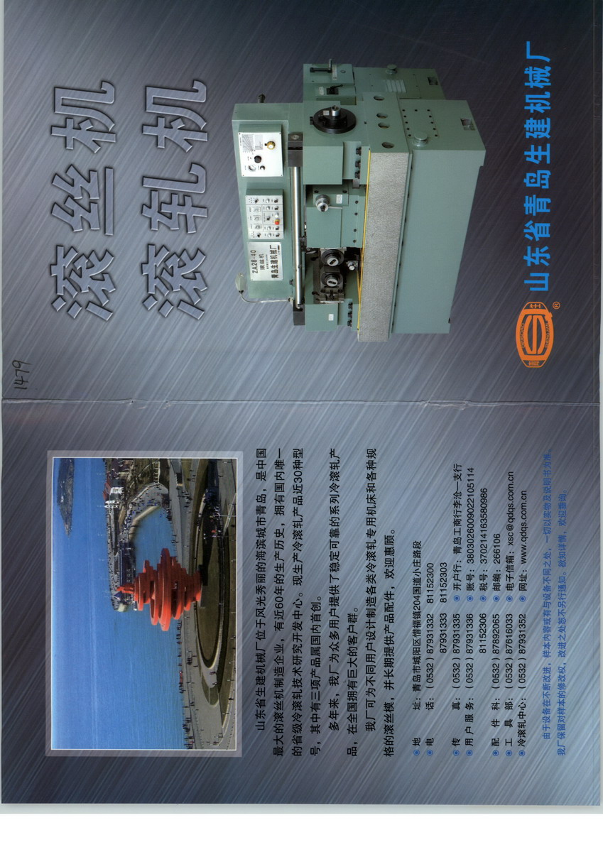 山东省青岛生建机械厂是中国最大的滚丝机、牛头刨床制造企业。现拥有国内唯一的省级冷滚轧技术研究开发中心,具有近60年机床生产历史,具有完善的制造工艺和完备的检测手段。我厂制造的滚丝机、牛头刨床产品居国际领先水平,质量稳定可靠。滚丝机曾获省优部优称号,牛头刨床曾获国优银质奖。凭借优质产品质量,主导产品滚丝机、牛头刨床的市场占有量逐年提高,稳居行业之首,属行业领军企业。我厂集近60年设计制造技术与经验之大成,不断开发系列新产品,其中有数控滚轧机、花键冷搓机、花键冷敲机三种产品填补国内生产空白。多年来,我厂生产的牛头刨床和冷滚轧系列的近30个规格型号的产品深受用户好评。山东省青岛生建机械厂全体员工将奉行“用户第一,信誉至上”的企业宗旨,帮您创业,祝您腾飞。