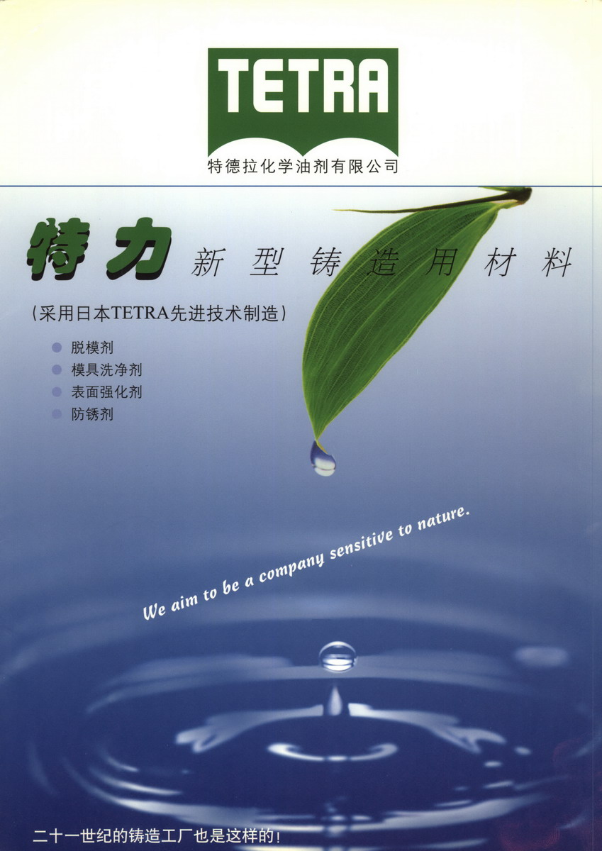 上海特德拉化学剂有限公司于2000年9月建立,制造和销售于一体,是国内唯一生产铸造用脱模剂的专业公司,特德拉公司秉承“质量第一、用户第一”的企业理念,向用户提供优质高效的“特力”系列产品。公司一直致力于无环境污染、无公害、无火灾危险、低用量高效能、节省资源的化学油品的研究与开发。多年来,积累了丰富的经验,具有强大的技术实力,其产品广泛使用于日本的铸造厂家,尤其在日本的汽车铸造厂家,更是一支独秀,为日本汽车工业的发展作出了贡献。上海特德拉化学油剂有限公司是日本株式会社テトラ(tetra)于2000年9月建立的独立公司。主要生产和销售“脱模剂”、“防锈剂”、“清洗剂”、“电子触点润滑防锈剂”。