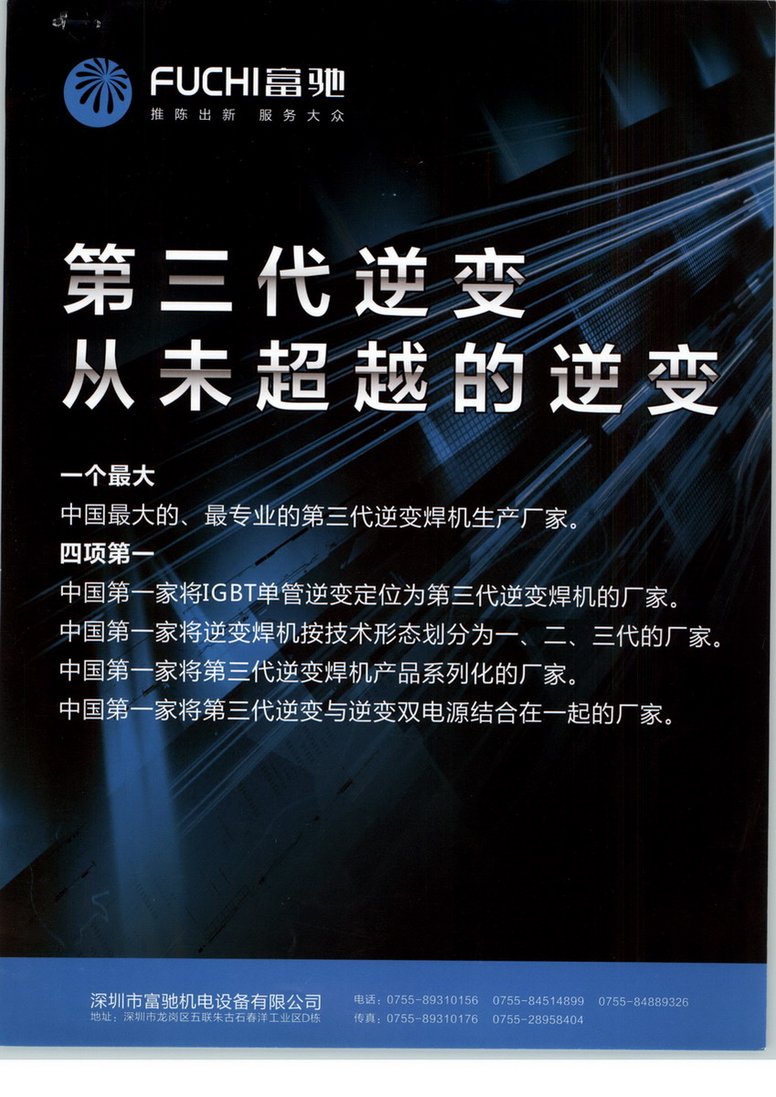 成立于1998年的深圳富驰机电设备有限公司, 是一家集研发,生产和销售为一体的高新技术企业。拥有自己独立的生产工业圆,员工近400人。其中专业技术开发工程师50多人,拥有较强的产品开发设计能力。设备齐全先进,吸收美国德国等国的先进技术。年产各类型的焊机和切割机上千台,完全能满足客人对品质和产能的要求。本公司技术力量雄厚,生产工艺先进,测试设备齐全。本"着推陈出新,服务大众”的企业宗旨,崇高技术创新,以优质的产品,合理的价格,快捷完善的售后服务,赢得了客户的信赖与支持。富弛机电公司致力研发生产:逆变式手工电弧焊机系列,逆变式氩弧焊机系列,可控硅氩弧焊机系列,二氧化碳焊机系列,埋弧焊机系列,高频感应焊机系列,储能式骡柱焊机系列,点焊机系列,等离子切割焊机系列等。公司全面通过CCC认证,CE认证。产品销往全球20多个国家和地区及国内30多个省市区,品牌信誉不断得到业内的认可。深圳富弛机电有限公司将不断改善品质和服务,强化品牌,为推动行业发展做出贡献。