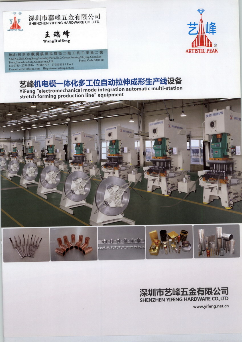 深圳市艺峰五金有限公司创建于1999年,现有厂房面积3000平方米,员工100多人,设备80余台套,集“多工位自动拉伸生产线”研制,精密多工位连续拉伸模具设计制造和五金制品生产为一体的高新技术企业。我公司自主研制的“多工位自动拉伸生产线”,是材料自动展开机、气动自动送料机、开式固定台多工位压力机、传动系统、凸轮退料系统、多工位柔性机械手、顶料系统、多工位连续拉伸模具、模具润滑系统、模具冷却系统、双向水平切边模机构、模具自动检测系统、产品输送机等的完美组合,实现了五金深拉伸产品高品质、大批量的自动化生产,大大降低产品成本,使客户产品的市场竞争力显著提高,达到双赢的目的。