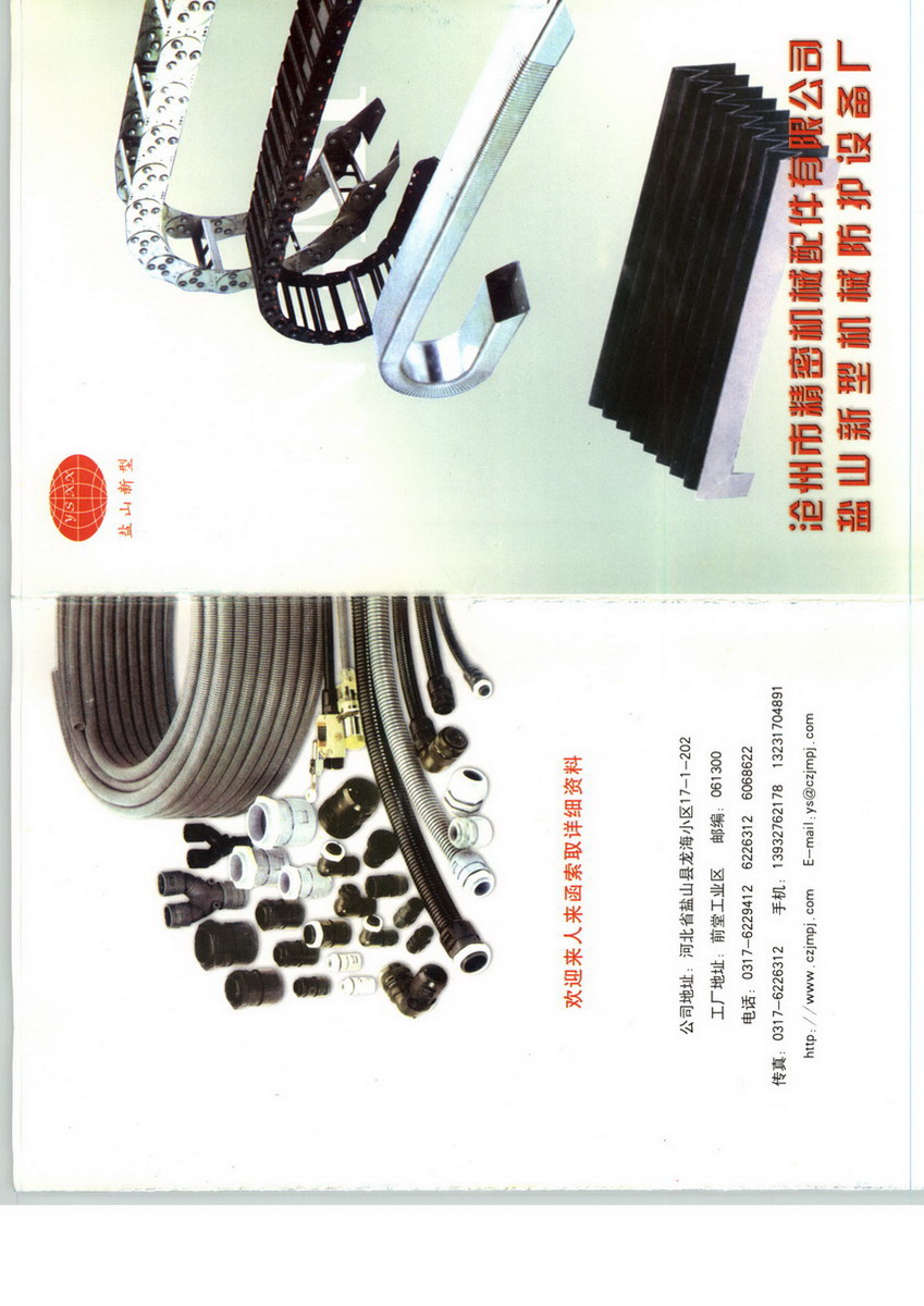 沧州市精密机械配件有限公司是一家集科研、设计、生产、销售于一体的大型股份制企业。下辖五个分厂,产品齐全。公司致力于数控机械及工业自动化精密配件的开发与研究,工艺水平梯级上升,新型产品不断推出并与世界著名的软管制造商PMA公司达成贸易合作伙伴。生产高档次的精密机械配件,使企业迅猛扩大成为河北机床配件供应同行之首。2000年被市政府评为十佳企业,拥有自营进出口权,产品畅销国内外。公司主要产品有各种材质的机床防护罩、工程塑料拖链、钢铝拖链、电线电缆防护系列、操作件、机床配套排屑系列、通风吸尘管系列、并承接铸造、注塑等业务。一流的产品、完善的服务,满足客户的需求。欢迎各单位选购我公司系列产品。我们愿与您携手合作共同发展。为数控机床行业做出应有的贡献。