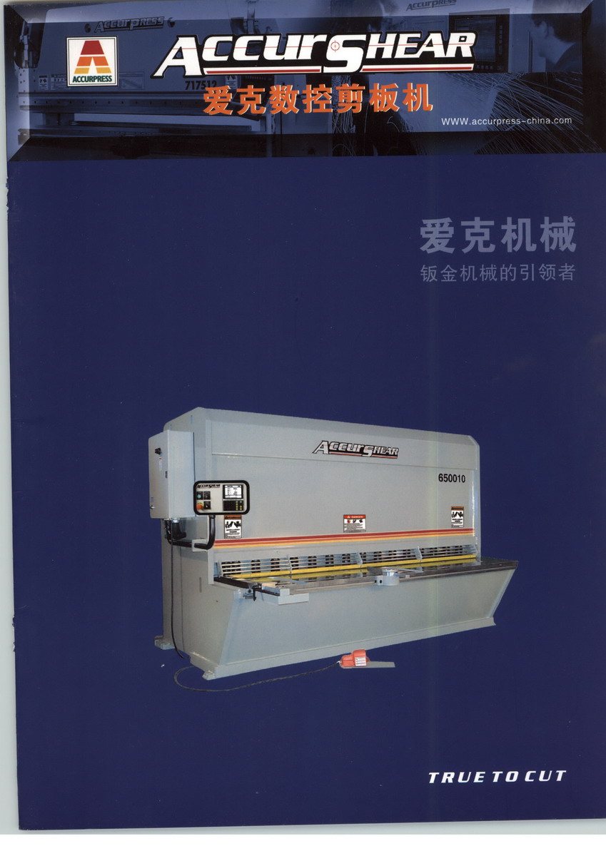 Accurpress爱克公司是一家在北美已30多年专业生产高质量数控折弯机(Accurpress)、数控剪板机(Accurshear)、数控精细等离子切割(Accrumax)的居于领头位置的名企业。产品连续多年北美销售第一。Accurpress爱克公司总部位于加拿大,在加拿大和美国同时拥有数家专业工厂,数百名工程师。Accurpress爱克公司已在北美及中国销售了数万台机器,通用、福特、波音、惠普、西门子、美孚石油、IBM等都是其主要的客户。其产品还被政府大量采购用于国防、航天、电力和军工工业。Accurpress爱克公司在苏州太仓独资成立了中国工厂,在中国批量生产高质量的数控剪板机和折弯机,为广大的中国客户提供与北美总部同样品质且更优惠的价格。我们以精益求精的制造理念,最优质服务,高科技培训设施,进一步加强我们对提高行业最佳客户支持的承诺。爱克将设计新颖、质量可靠、价格合格的机器推广到全球市场为己任,为所销售的每一台机器提供最尽职的服务与客户支持。
