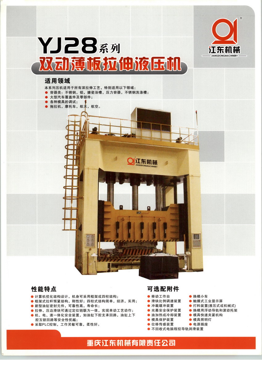重庆江东机械有限责任公司(以下简称为江东机械)通过七十年的发展,已经成为中国西部规模最大、综合实力最强的专业液压成形设备制造企业。 公司占地458亩,总资产超过3亿元,拥有现代化标准厂房7万余平方米,员工1000余人,拥有各类专业技术人员150余人,其中国家级专家2人、市级专家4名、高级工程师6名;在机械设计方面拥有国家级专家1名,市级专家1名,高级工程师2名;在液压设计方面拥有国家级专家1名,市级专家1名,高级工程师2名;电气设计方面拥有市级专家2名,高级工程师2名;另外,江东机械拥有各类专业加工设备200余台(套),完全具备为用户提供5000KN-60000KN的各种大型、快速、精密、专用的全自动液压机及成套生产线的综合实力,月平均制造能力达到100余台,年创产值能力达到4亿元以上。公司与机械科学研究总院、中国汽车工程研究总院、济南铸锻研究所、西安重型机械研究所、上海交通大学、北京航空航天大学、华中科技大学、重庆大学、重庆理工大学、中南林业大学、重庆机电研究院等科研院所合作研发,为产品的创新打下坚实基础;在产品中广泛采用液压比例伺服控制技术、位置数字控制技术、同步控制技术、PLC触摸屏和工控机控制技术;通过技术合作和自主开发,我公司已掌握和运用当今液油压机、人造板机械的最新技术,并锻炼和造就了一批液油压机等产品专业研究、开发、设计技术队伍,能够为国内外客户提供“量体裁衣”的产品,满足用户的需求。江东机械针对用户个性化的工艺需求已经开发出了20余种、200多个规格型号的液压机产品,被广泛应用于金属材料的压制、弯曲、翻边、挤压成形及非金属材料如橡胶、塑料、玻璃钢、绝缘材料和磨料制品的压制成形。产品已经服务包括汽车、铁路、摩托车、五金、家电、建材等众多行业领域,产品畅销全国二十多个省(自治区),并出口到德国、日本、韩国、埃及等二十多个国家和地区。