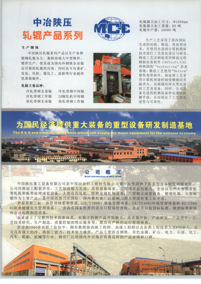 中冶陕压重工设备有限公司是中国冶金科工股份有限公司暨中冶集团旗下的重型设备研发制造企业,公司冷热加工配套齐全,工艺制造能力先进,具有设备成套、工程项目总包能力。企业以生产大型精密板带轧机和板带处理成套设备;大型有色轧制设备;特种金属轧制设备;大型锻压成套设备;锻钢轧辊;大型铸锻件为主要产品,是中国西部乃至国际、国内都有着广泛影响力的大型国有重工业企业。企业具有三标一体管理体系和资质( GB/T19001质量管理体系、GB/T24001环境管理体系和BG/T28001职业健康安全管理体系),并具有国家批准的进出口贸易经营权。企业可以按国际标准,欧洲标准和国外公司标准制造设备。企业建立了完整的技术创新体系,有独立的新产品开发能力,从市场开拓、产品研发、产品设计、工艺技术研究、生产制造、质量控制到售后服务,具有严格的运行管理体系。在企业3300多名职工队伍中,拥有教授级高级工程师、高级工程师以及各类工程技术人员 800余人。公司具有强大的冷、热加工能力,技术实力雄厚,产品主要涉及钢铁、有色金属、矿山、电力、石油、化工、汽车、船舶、机械等行业,拥有广泛的国内外市场并有着良好的产品业绩和口碑。公司已形成年产冶金及锻压设备 50000 吨的生产能力,产品形成了 15 个系列,200 多个品种规格,主导产品有:各种黑色、有色板带轧制设备,板带连续处理设备以及板带精整设备。代表产品有:大型冷、热板带轧机;平整机;开卷与卷取机;矫直设备;热镀锌、镀锡机组;连续退火机组;酸洗机组;板带纵、横剪切机组;板带矫直设备;各种飞剪、液压剪;方坯、板坯连铸设备。大型锻压设备有:大型金属挤压机、锻造液压机、操作机、液压压力机;硬齿面传动箱;各种大型冶金备件等。大型锻钢轧辊和铸锻件,具有年生产 2万吨成品锻钢轧辊(单件轧辊最大直径 1.65米,最大重量 65吨);2.5 万吨大型铸钢件(最大单重铸钢件可达 240 吨);4.5 万吨锻件(最大单重锻钢件可达 90吨);以及 9 万吨锻造用钢锭的生产能力。公司致力于打造为国民经济提供重大装备的国内一流、国际知名的专业化冶金设备及大型成套设备的研发、制造基地;打造中国西北地区最大的锻钢轧辊生产基地;打造以生产、销售铸锻件、焊接件、热处理件、机械零部件以及相关材料、相关技术为主的大型铸、锻件生产基地,以新的起点和高度、竭尽全力为客户提供适用的精品、名牌、成套、创新产品,让企业的产品为社会创造价值并使客户获得利益,使企业在为社会和客户服务的过程中同时得到持续发展和提升。