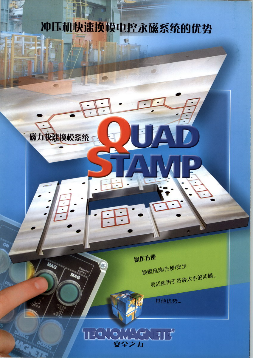 泰磁快速换模系统作为一个完整的解决方案用来满足先进的制造过程中小批量、多类别生产的JIT(实时生产)和SMED(快速更换)的要求。 采用完美的“双磁极对流”技术,具有磁场集中,磁吸附力强,不磁化设备,克服间隙能力强,磁穿透高度可控等优点。将电控永磁的磁力的应用发回到极致。 意大利泰磁公司Tecnomagnete S.p.A.始建于1972年,是全球电控永磁产品领域中的领先公司,发明了一系列革命性创新产品,设计、制造全系列电控永磁夹持及吊重系统。产品包括:注塑机快速换模系统、铣削、磨削、立车、铁轨加工用电控永磁夹盘、手动永磁吊重器及重型电控永磁吊重设备(用于成卷钢带、大型钢板等的吊运)等。