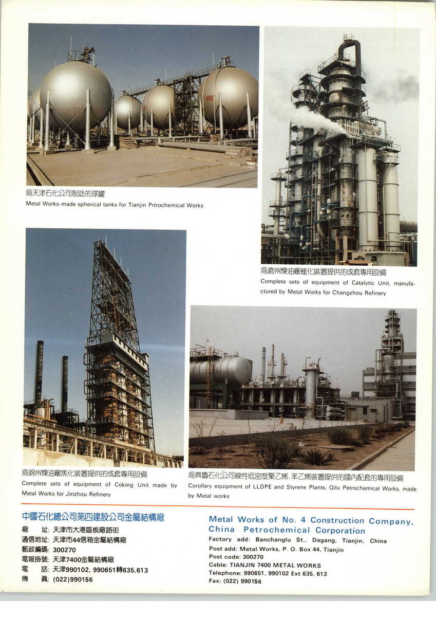 公司历年承建国内外各类工业装置千余套。先后参加了朝鲜、科威特、新加坡、沙特阿拉伯、阿联酋、香港等国家或地区的40余套石油化工生产装置建设。