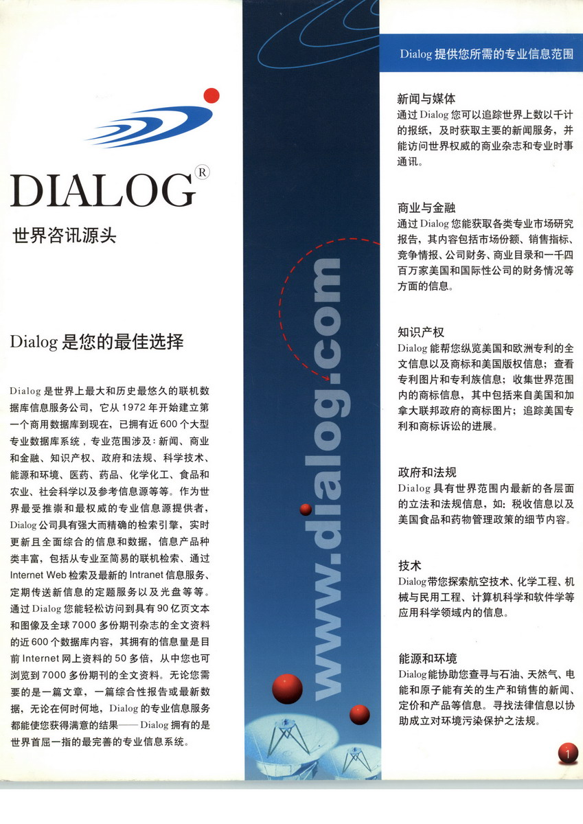 DIALOG系统是目前世界上最大的国际联机情报检索系统,覆盖各行业的900多个数据库,其数据类型主要有4种,即文献型、数值型、名录字典型、全文型,涉及40多个语种。Dialog收录的信息涉及的专业范围广泛,按涉及学科的领域被分为20类。信息总量约15TB,共有14亿条记录,文档的专业范围涉及综合性学科、自然科学、应用科学和工艺学、社会科学和人文科学、商业经济和时事报导等诸多领域。在Dialog系统资源中,各种类型的商业性数据库多达400个左右,占有举足轻重的地位。存储的文献型和非文献型记录占世界各检索系统数据库文献总量的一半以上。Dialog系统在全球六个大洲100多个国家保有两万五千位客户。