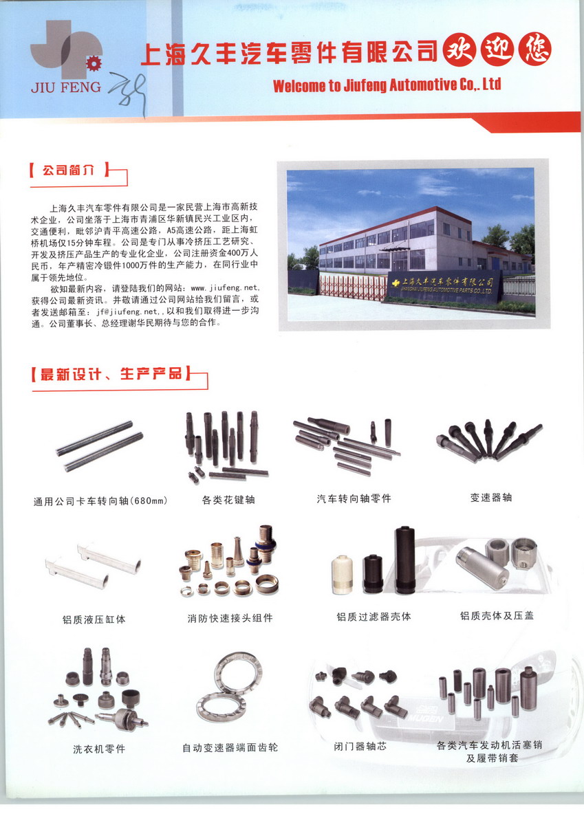 上海久丰汽车零件有限公司 是专门从事冷挤压工艺研究、开发及冷挤压产品生产、加工的专业化民营企业。公司注册于上海市青浦区华新镇,注册资金400万元人民币,厂区占地30亩[20000m2],厂房面积8000m2。现有职工150余人,其中高、中级技术人员十余人。董事长、总经理 谢华民 先生毕业于上海交通大学锻压工艺与设备专业并在上海交通大学锻压教研室、上海模具技术研究所从事教学、科研及管理工作十余年,在冷挤压工艺及模具设计制造方面具有较丰富的实践经验及扎实的理论基础。公司拥有800T冷挤压机一台,500T压机1台,500T以下压机24台(其中专用冷挤压机5台,有2台为加长冷挤压机专用于挤压超长花键轴类)。公司拥有从下料、去皮、表面处理等完整的冷挤压加工生产线。公司主要面向国内外汽车、摩托车、工程机械及农机等行业,生产各种规格型号的精密齿轮轴、花键轴、凸轮轴、传动轴及转向器轴。现每年生产各类精密冷挤压件约1000万件,其中最长的花键轴为768mm,最大的冷锻件为8kg 。公司拥有强大的工艺技术力量,能够独立的完成冷挤压产品的工艺设计和开发,能够独立的完成冷挤压模具的设计和制造。公司拥有自己的模具车间,承担公司所有生产用模具和新品开发模具制造任务。在模具材料方面大量使用优质冷锻用钢、各类精密齿形模具全部采用硬质合金(部份采用进口硬质合金),各类精密冲头全部采用进口高速钢和超硬合金,并大量采用表面镀层技术。因此产品的精密度高、寿命长,产品尺寸稳定性好。公司在有色金属方面大批生产各种规格铝制过滤器壳体、过滤器底座、气动液压缸体、铝制消防快速接头等,其中铝合金冷挤压件已批量出口日本,并可生产铜制冷挤压件。公司目前已通过ISO9001质量体系认证,并于2005年、2008年、2011年三次被认定为 上海市高新技术企业 。公司是青浦区专利试点企业,拥有发明专利8项,实用新型专利8项,正在实审的发明专利2项。