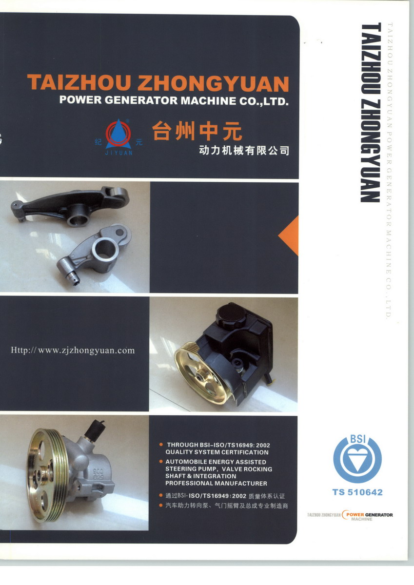 台州中元动力机械有限公司,地处风光秀丽的中国浙江东南沿海花园港口城市:“玉环”。公司现有员工178人,建筑面积18600㎡。公司专业制造,生产汽车助力转向泵及部件、气门摇臂总成,涨紧轮,调压阀,高强度螺栓等系列产品,是国内主机制造商定点配套企业,并出口欧美,中东等市场。公司已通过TS16949:2009质量管理体系认证,有一支专业,高效、务实的员工队伍,拥有高端的生产设备,检测设备。公司多次被政府及有关部门,主机制造商评为“星级企业”,“重合同守信用单位”,“质量优秀供应商”等称号。公司始终坚持以“制造精品,不断满足客户需求”的服务宗旨,追求“与员工共成长,为客户创造价值,为社会创造价值”的经营理念,竭诚欢迎国内外客商前来洽谈、合作。