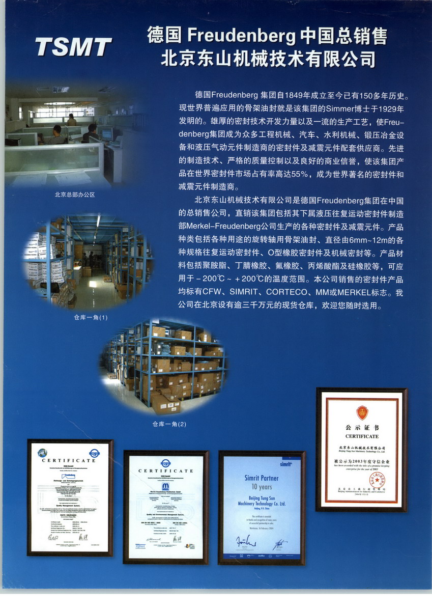 北京东山机械技术有限公司(TSMT)成立于1994年,是香港东山工程有限公司(TSE)董事长在1992年成功将世界最大的密封件与减震元件制造商德国FREUDENBERG密封与减震技术集团公司(FDS)产品引进中国后,专门在北京注册成立的一家香港独资企业,全面负责德国FDS集团产品在中国市场的销售和推广。