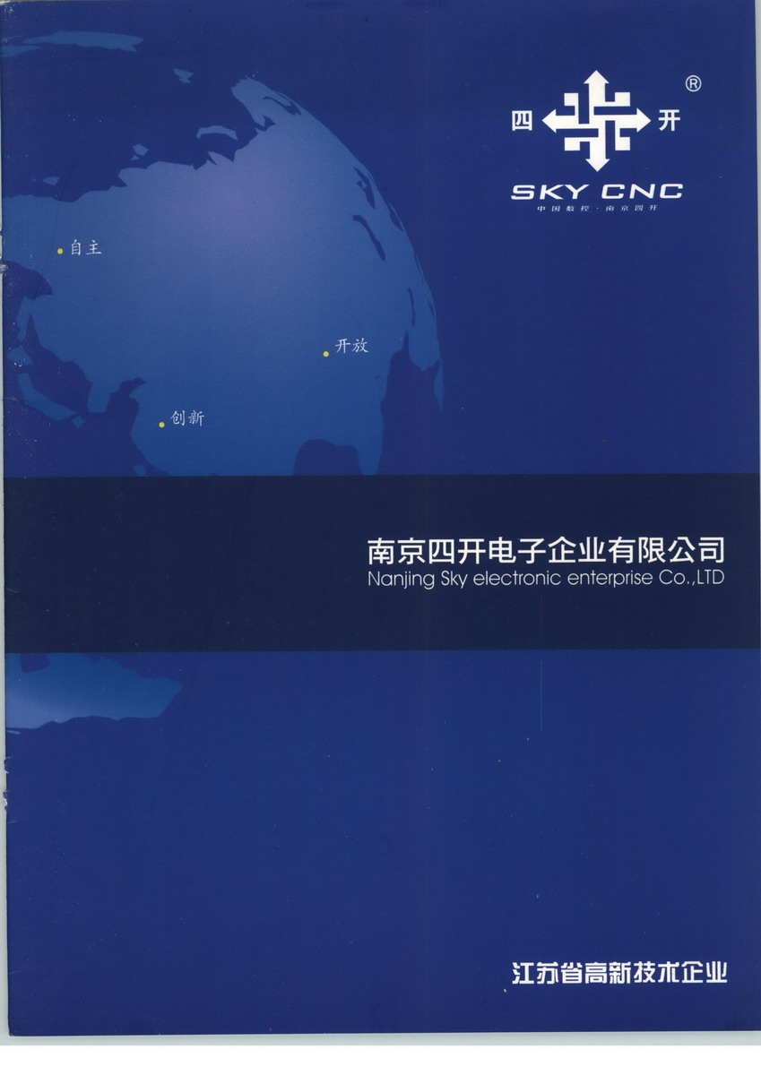 南京四开电子企业有限公司是从事数控系统及数控机床开发、研究、生产和经营的高科技企业。公司自九三年成立以来,以发展中国数控技术为已任,进行了大量系统的基础研究和开发,走出了一条我国PC数控技术的全新道路,成功研制出具有自主版权的SKY数控系统,为发展我国数控技术、打破国外垄断,做出了应有的贡献,多次得到国家有关部委的高度评价。