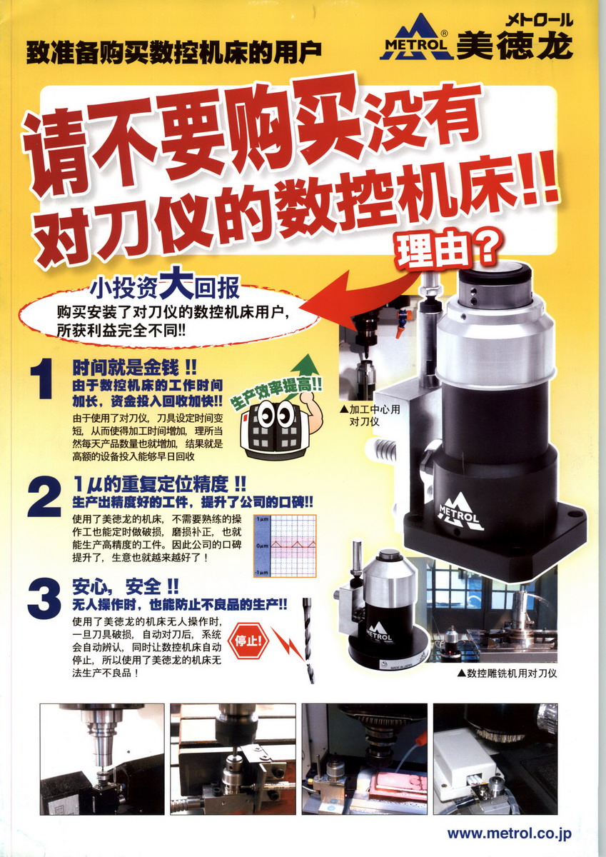 在数控机床领域,我们在1976年发明了世界上第一台用在数控车床上的数控机床用对刀仪。1995年,我们的创始人被日本科技省授予科技长官奖,目前,我们的高精密传感器已经被全球60多个厂商实用,因为我们的传感器能够成功的为客户提高成本效率和客户的生产力。在接触式传感器领域,美德龙认识到,相比于传统传感器,譬如限位开关,接近传感器和光电开关,接触式高精密传感器更加可靠,精密,紧凑,简便和更经济。因此美德龙超越了传统传感器,开发了既能位置识别又能空间区别的接触式高精密接触式传感器, IP67显示了其超强的防护等级,能够对抗任何恶劣的环境,目前,我们正继续积极在高精度和实用性两方面来发展和扩大美德龙品牌。
