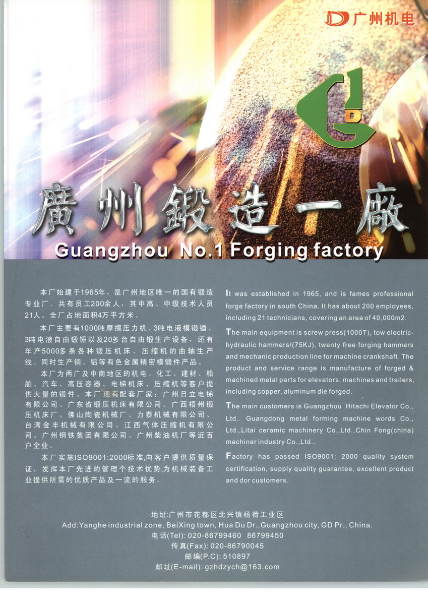 广州锻造一厂于2008年11月4日正式改制为广州锻造一厂有限公司,是隶属广州电气装备集团有限公司的全资国有的有限责任公司,是广州地区唯一的国有锻造专业公司,现已成为广东乃至周边地区锻造龙头企业,年销售额达1.5亿元。主要为锻压机床、陶瓷压机、港口机械、柴油机和石油管道等提供锻件毛坯、半成品及成品。 主要设备有:双臂自由锻电液锤、单臂自由锻电液锤以及多台自由锻生产设备、1000T摩擦压力机、3T电液模锻锤,本公司参股的广州清水银禾锻造有限公司,可以供给铜、铝等有色金属及汽车等精密模锻产品;子公司——广州越鑫曲轴制造有限公司拥有一整套年产10000多条各种锻压机床、压缩机的曲轴和直轴机加工专业生产线。 2008年投资建设的2000吨油压机项目占地2000多平米,新车间的配套设施相当完善。 可生产拔长单件15T,镦粗单件8T的锻件。 本公司经中国船级社船质量体系认证,实施ISO09001:2008标准,并获得中国船级社船用产品公厂认可,拥有完善的检验设备,向客户提供质量保证,发挥本公司先进的管理和技术优势,为机械装备工业和船用产品提供所需的优质产品及一流的服务。