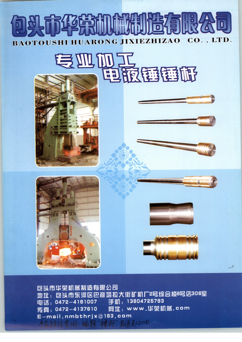 包头市华荣机械制造有限公司专业生产加工电液锤锤杆,产品遍及全国20多个省市,特别是江、浙、沪和东北三省以及首钢、锡钢、新大冶、西钢、长城特钢、抚顺特钢等特钢厂,一汽、南汽、哈飞、西航等特大型企业。公司主要给北京异辉公司、北京理工大学、海安百协、北京宁远等电液锤制造商提供配套锤杆,材料采用军工优质炮钢。我公司能独立完成全部热处理工序。