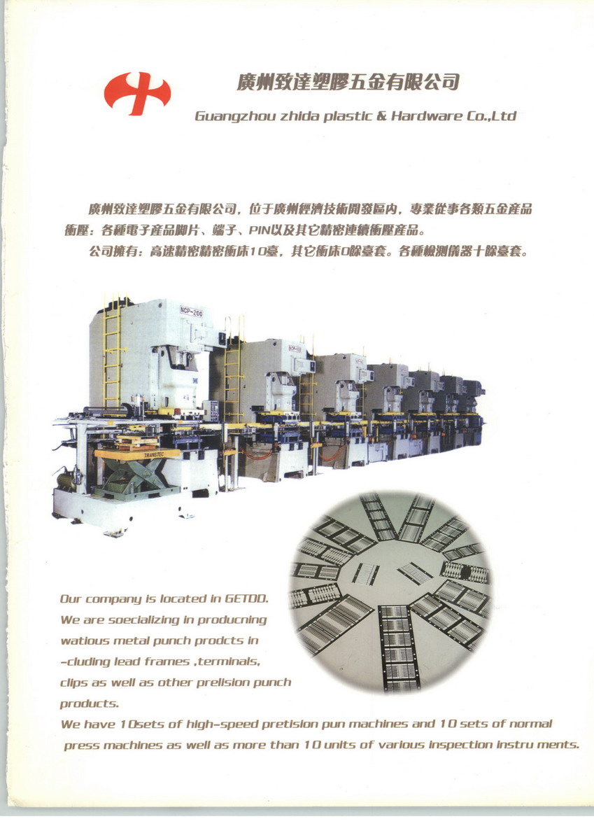 广州致达集团位于广州经济技术开发区内,公司拥有:广州致达塑胶五金有限公司,致达(德阳)精密电子有限公司,广州黄海精密模具有限公司。公司主要产品:大功率LED支架、模条、透镜;网络电子变压器底座、支架;各种精密冲压、注塑模具。广州市区高新技术企业(广州黄海精密模具有限公司)公司大事记:1994年:成立专业生产精密模具为主的广州黄海精密模具有限公司,从事电子分离器件的塑封、切断等模具的设计、生产制造。2000年:进入网络电子变压器模具行业,为众多网络电子变压器提供相关封装和打弯切断模具。2003年:成立广州致达塑胶五金有限公司,从事各类精密五金冲压件、精密塑胶件的生产加工,初期主要生产各类网络电子变压器用框架和外壳。 2005年:开始生产大功率LED支架。2006年:开始研发半导体产品用Lead frame,同年成功自行生产出SOT-23用Lead frame。2007年:为了配合公司未来发展,公司在四川德阳投资的“致达(德阳)精密电子有限公司”开始进入正式运做,当年年底投如了生产。2010年,致达(德阳)精密电子有限公司新厂房如期投入使用,致达集团的发展进入了一个新的平台。未来目标:未来公司将为发展成为中国精密冲压及注塑行业中标志性企业而努力。