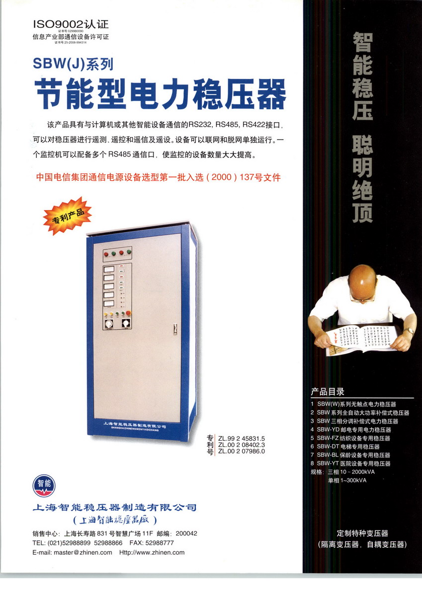 上海智能稳压器制造有限公司自建成以来,一直勇于尝试开发研制新产品,突破产业瓶颈,从初期的以生产油浸感应式稳压器为主,逐步发展成生产大功率补偿式、带智能接口遥控式稳压器,直至今日大规模投产智能控制无触点免维护型的全新一代电力稳压器,无数次带领行业迎接机遇与挑战。特别是公司参与设计和研发的SBW-WB系列无触点补偿式稳压器这款新型龙头产品,它集先进的组合绕组补偿方式和可控硅无触点开关,微机控制交流稳压技术于一体,具有高效节能环保,快速调节,三相自动平衡,无机械传动,免维护,无噪声等特点,多路同步切换,提高了稳压器调整时间,有效地消除了触点开关产生的共态电流冲击,防止过电压对系统和器件的损害,极大地提高了设备的稳定性,可靠性,节能性以及人机界面的合理化,人性化。