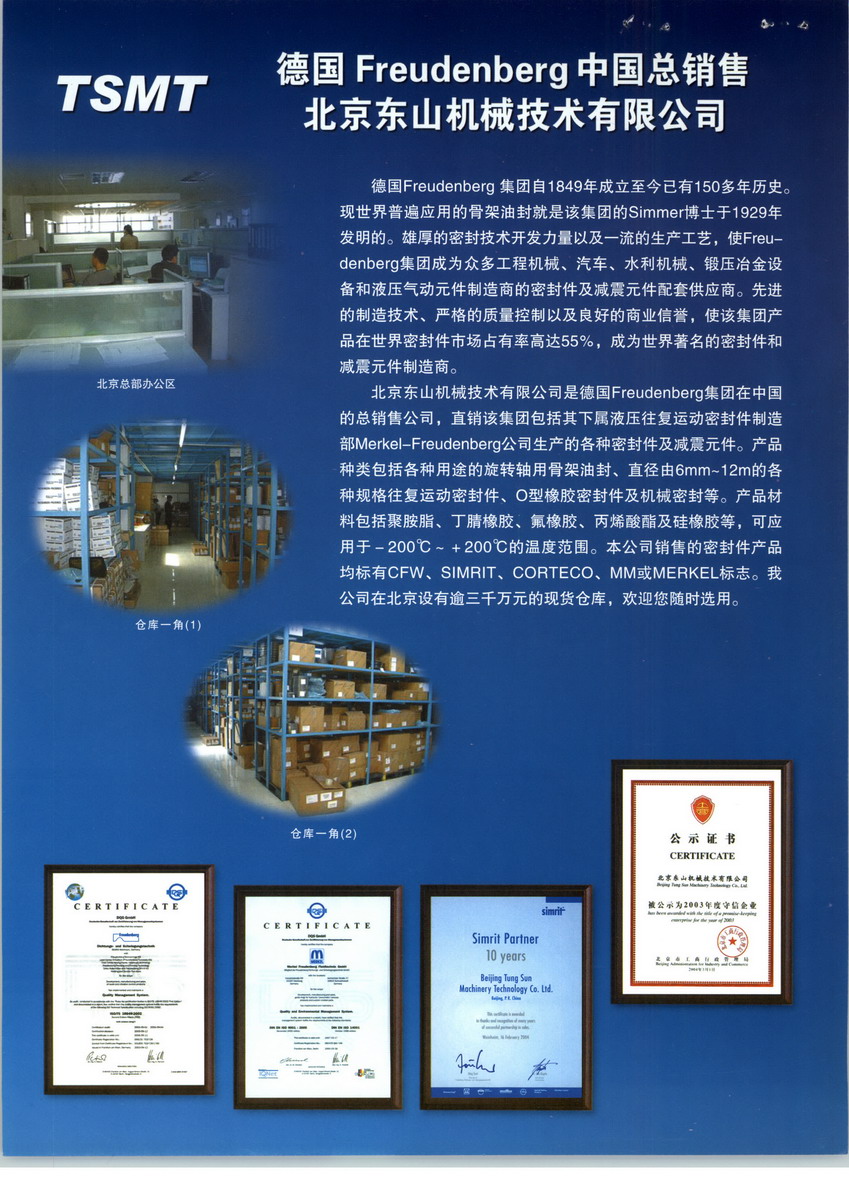 北京东山机械技术有限公司(TSMT)成立于1994年,是香港东山工程有限公司(TSE)董事长在1992年成功将世界最大的密封件与减震元件制造商德国FREUDENBERG密封与减震技术集团公司(FDS)产品引进中国后,专门在北京注册成立的一家香港独资企业,全面负责德国FDS集团产品在中国市场的销售和推广。