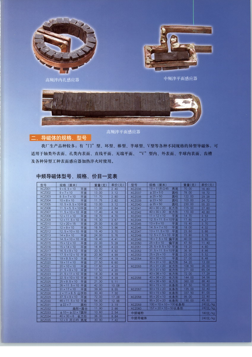 分便利,且设备齐全,技术力量雄厚,制造工艺先进。本厂成立于1980年,是中国热处理行业协会团体会员单位。为了提升我国感应加热水平,缩小与国际先进水平的差距。我们一直不断致力于科技进步,技术创新,引进国外技术,开发了一系列高频、超音频、中频用可加工型导磁体、泥糊状导磁体,填补了我国导磁体行业的空白。产品质量已达到国内同类产品的先进水平。