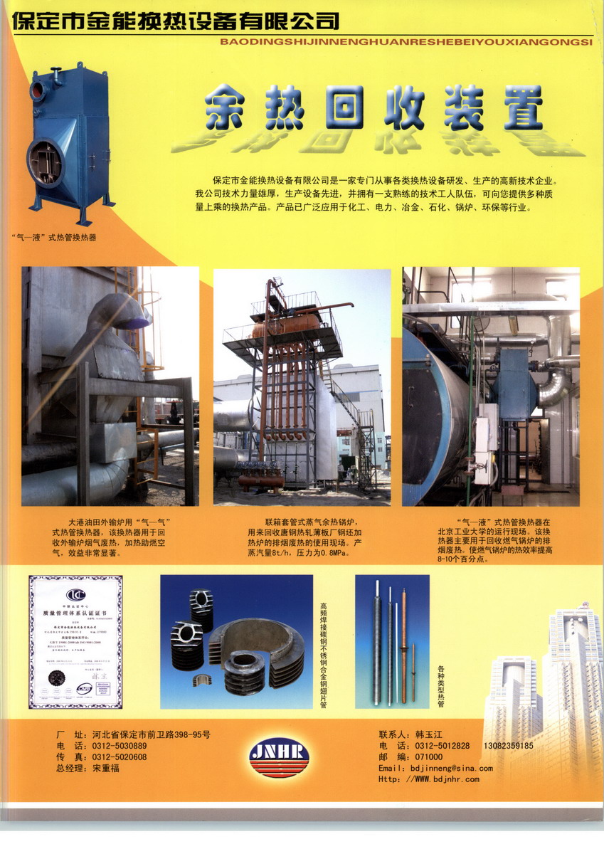 保定市金能换热设备有限公司是由原保定市机械电器研究所改制组建而成。经过多年奋斗,已发展成为一家专门从事各类换热设备设计、生产的高新技术企业。公司下设空气冷却器、余热回收装置以及锅炉压力容器类产品制造三个事业部。公司拥有一支经验丰富的从事换热节能和机电设备设计的专家队伍,其中高级职称人员8 名,中级职称人员16名,同时长期聘请北京、天津地区大学教授及科研单位专家12名作为技术顾问,同时招收了一批近年毕业的大学毕业生并长期聘用,形成了一支新老结合,校企结合,具备雄厚技术实力的研发队伍。经过多年努力,公司取得了大量的科研成果,获得了多项省部级科技进步奖和节能奖,有多篇学术论文发表在国内期刊和全国热管会议上,公司具有完善的生产设施和过硬的生产队伍。同时获得了十三项换热设备国家专利,即:一种淬火油冷却和回收其余热的热管换热设备 专利号:ZL 201310176520.3;淬火介质空气冷却器 专利号:ZL 032 49016.X;感应加热设备全封闭空气冷却系统 专利号:ZL 2011 2 0319224.0;复合式热管换热设备 专利号:ZL 2007 2 0128522.5;带有翅片的螺旋沟槽换热管 专利号:ZL 2008 2 0132976.4;一种淬火油冷却和回收其余热的热管换热设备 专利号:ZL 201320259690.3;一种深度回收烟气中冷凝水潜热的燃气锅炉 专利号:201320712598.8;第三代烟气余热回收冷凝器专利号:ZL201420073823.2等。目前,公司可以设计生产多种节能、环保及高效的换热设备。主要产品有三大类:空气冷却器、余热回收设备及锅炉、压力容器这三大类的产品以及配件,包括冷却各类介质的空气冷却器、冷却中高频感应加热电源设备的空气冷却器及其他各种空气冷却器;余热回收装置、锅炉、余热锅炉、各类余热回收换热器、冷凝器、加热器、交换器、风机、各类低中压压力容器、真空干燥机、热风炉等;高频焊接不锈钢(1Cr18Ni9Ti、0Cr18Ni9)、合金钢(12Cr5Mo)及耐腐蚀的ND钢和碳素钢螺旋翅片管,并可按用户要求生产加工各类换热设备。公司研发的余热回收热管换热器产品被国家工信部列入《节能机电设备(产品)推荐目录》(第三批);空气冷却器产品被财政部、国家税务总局、国家发展改革委关于执行环境保护专用设备企业所得税优惠目录,节能节水专用设备企业所得税优惠目录和安全生产专用设备企业所得税优惠目录,财税〔2008〕48号文件;财税〔2008〕115号文件。2010年空冷器产品被中国机械工业联合会授予“机械工业节能机电产品” 称号。2009年被中国热处理行业协会列入《热处理行业节能和清洁生产先进技术与装备目录》公司的换热设备已遍布全国二十几个省、市、自治区,部分产品已出口到泰国、土耳其、越南、日本等国家,用户分布在石油、热处理、化工、钢铁、冶金、汽车、电力、建材、轻纺、环保等行业。