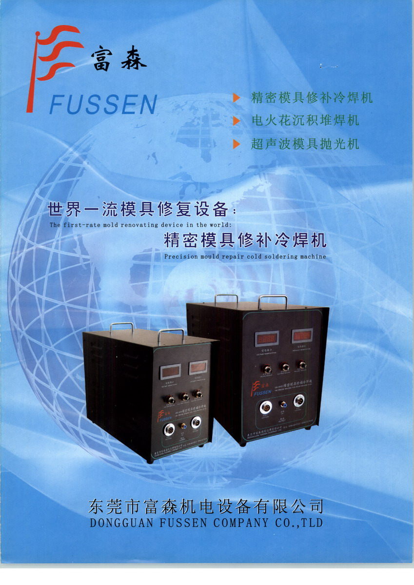 东莞市富森机电设备有限公司是国内首家引进德国领先冷焊技术机构之一,在国际制造业名城----中国东莞市已率先设立冷焊设备组装加工生产基地,FUSSEN牌冷焊设备在欧美地区已广泛应用到各行各业,目前在中国还属新兴科技产业,富森机电设备有限公司自2005年开展中国区域业务以来,已迅速由东莞辐射至全国各省市形成以东莞为核心覆盖全国的营销网络,为众多制造企业提供匹配冷焊设备,同时为企业降低了大量的生产成本,保障了企业可持续发展。公司每年都积极参加国内各大型机电展览会,极力拓展海内外市场,目前公司主营业务以精密模具修补冷焊机、金属缺陷修补冷焊机、微束冷焊机为首席产品,以超声波模具抛光机、气动研磨工具为辅助产品,为各制造企业降低生产成本与提高运营效率提供最完善的解决方案。FUSSEN牌冷焊机应用范围包括:电子、电气设备、电力、通信、模具、汽车、机车、飞机、造船、铸造机械等制造企业。公司秉承团结、奋进、务实、精心、创新发展的思想理念,以客为尊以技术领先为导向与广大客商建立长久密切合作关系,并长期提供技术支持.富森本公司的产品精密模修补冷焊机,是利用高频电火花放电原理,对模具进行无热堆焊,以保证模具的完好性,也可以利用强化功能对模具进行强化处理,来实现模具的耐磨性、耐热性、耐蚀性等等。以及产品对模具的要求不断提高,越来越多的高端精密模具投入使用,在模具不断的使用过程中,不可避免的会出现对模具的伤害,诸如磨损、划伤、针孔、裂纹以及缺损等缺陷。传统的修复设备再一定程度上,帮助客户对模具进行修复以节约成本。但也不可避免的出现了一些问题,如修复模具后造成模具变形、硬度降低、内应力、沙眼、损伤甚至报废。精密模具修补冷焊机,有"模具修复专家"之称。专用于修复各类金属设备、机件、模具等。广泛用于模具制造业、航空航天工业、汽车制造修理业、造船工业、机械工业、铸造工业、电力工业、化学工业等领域。