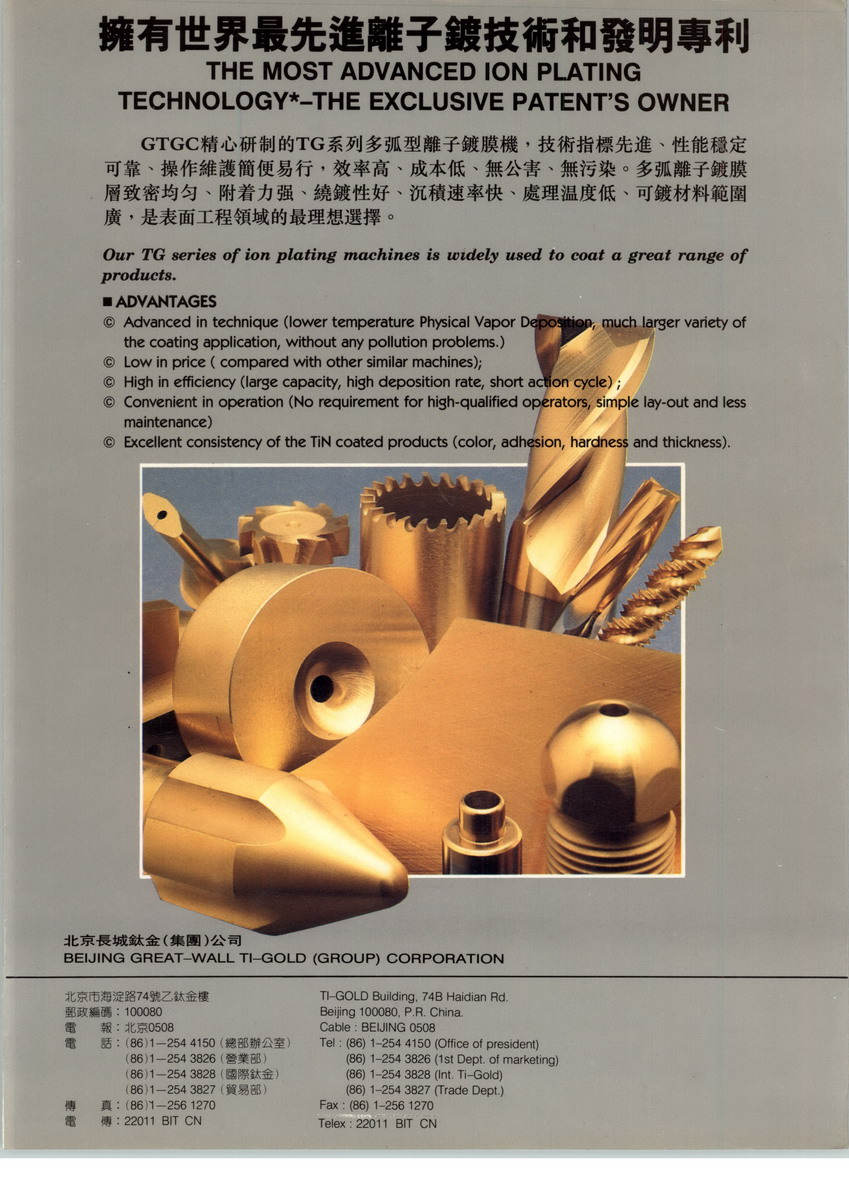 北京长城钛金公司致力于镀膜技术的研究与应用,是中国首屈一指的物理蒸 气沉着(PVD)镀膜技术的科研成果开发,设备制造和销售中心。真空离子镀膜的第 三代技术,等离子体加速器型离子镀膜法,是当今国际上最先进的表面工程技术 之一,也是复合材料领域里的一项高难课题。用此法得到的膜层,除具有细密均 匀,结合力强,超硬,耐磨,抗腐蚀,良好的导电性能和自润滑性能等优点,还 能提供丰富华丽的色彩。本公司生产的TG系列设备,可用来镀单层或复合层 的TiN,ZrN,TiO,TiC,TiNC,TiAlN或稀贵金属Au,Ag,Ta,Nb,Mo,W等装饰 和功能涂膜。可用于钟表,首饰,灯具,餐炊器具,五金工艺,玻璃,陶瓷,卫 浴和建筑材料等类似产品的表面镀膜,其特点是色彩丰富、品质高贵。另一方面 ,钛金功能镀在工具,模具,重型机械,航空,航天,舰船,兵器和电子等领域 也有日益广泛的应用前景:硬质的功能膜层不仅可以提高工件的使用寿命,而且 提高切削速度,表面光洁度和抗腐蚀性与耐磨性,大大地提高机械制造业的自动 化程度。作为同行业的龙头,长城钛金公司为适应国际化的需要,又率先将 TG系列离子镀膜设备提高到了国际水准:成为中国同行业里唯一的企业,既达到 美国的UL标准,又获得欧洲的CE证书 公司后续引进开发爆炸喷涂设备,欢迎到北京长城钛金公司访问考察!