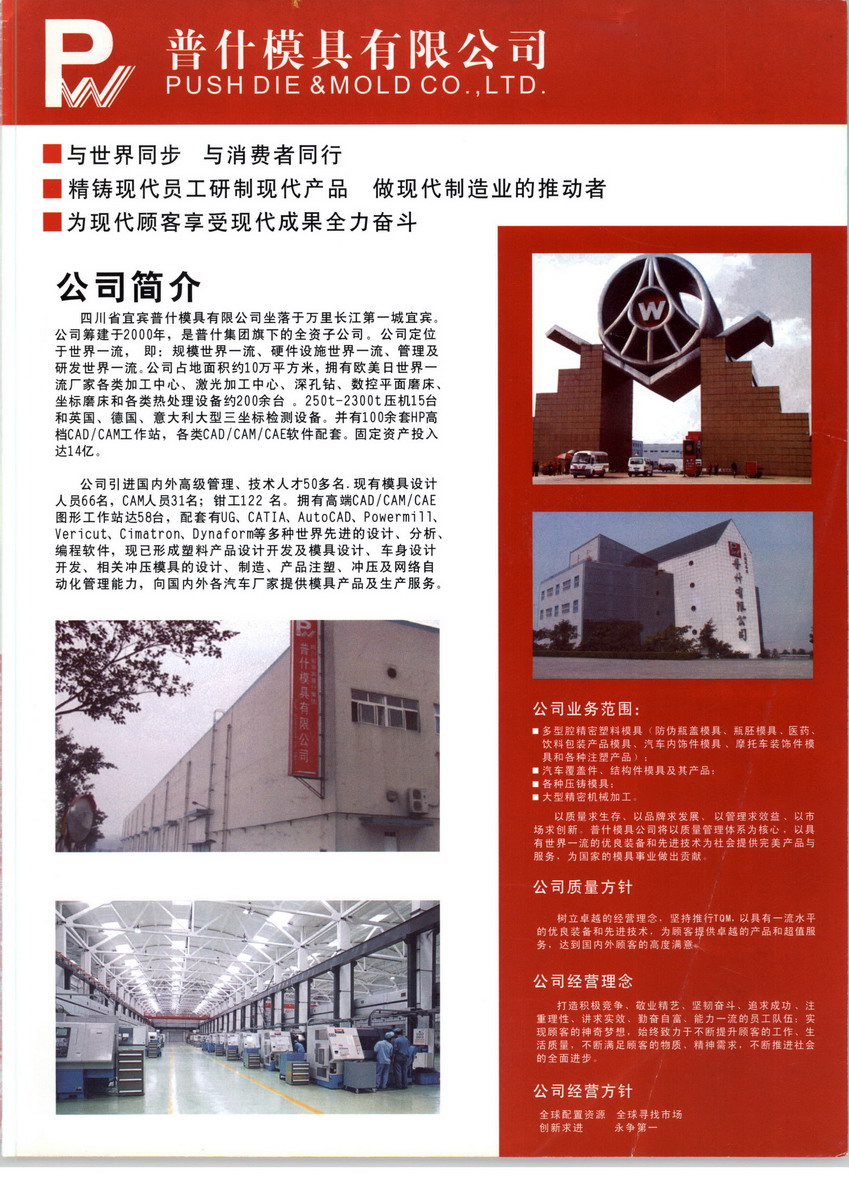 普什模具有限公司座落于万里长江第一城--宜宾,于2000年开始筹建,隶属于五粮液旗下的普什集团有限公司。公司主要从事多型腔、高精密塑料模具,注塑系统的开发、设计和制造;占地面积约15000平方米,固定资产投入达3亿元人民币;现有员工约270人,高级技术及管理人才33人,获得各级技术与技能职称聘任的人员158人,占全公司总人数的57%;大中专以上学历人员占比90%,十年以上员工占比61%,为公司的经营发展提供了稳定有力的人才保障。公司定位于世界一流,经过10余年的发展,现已形成以研发、设计和制造注塑模具为核心,为客户提供全套注塑系统解决方案的能力。