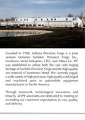 Indiana Precision Forge, L.L.C. (IPF) supplies a wide variety of precision, high quality cold forged and machined parts to the automotive industry. Using the latest in forging technology, we currently have the capacity to produce more than thirty million cold forged parts per year. To provide additional value to our customers, we also have the capability to provide finished, machined parts, or semi-machined parts, after the forging process.Established in 1996, we are a subsidiary of Sumikin Precision Forge, who is a recognized leader in cold forging technology. We utilize only the highest quality raw material supplied by first class steel mills, including our parent company, Sumitomo Metals (Kokura). The combined resources and technological capabilities of Sumikin Precision Forge, Sumitomo Metals, and Indiana Precision Forge makes us a leading supplier of cold forged parts to North America.