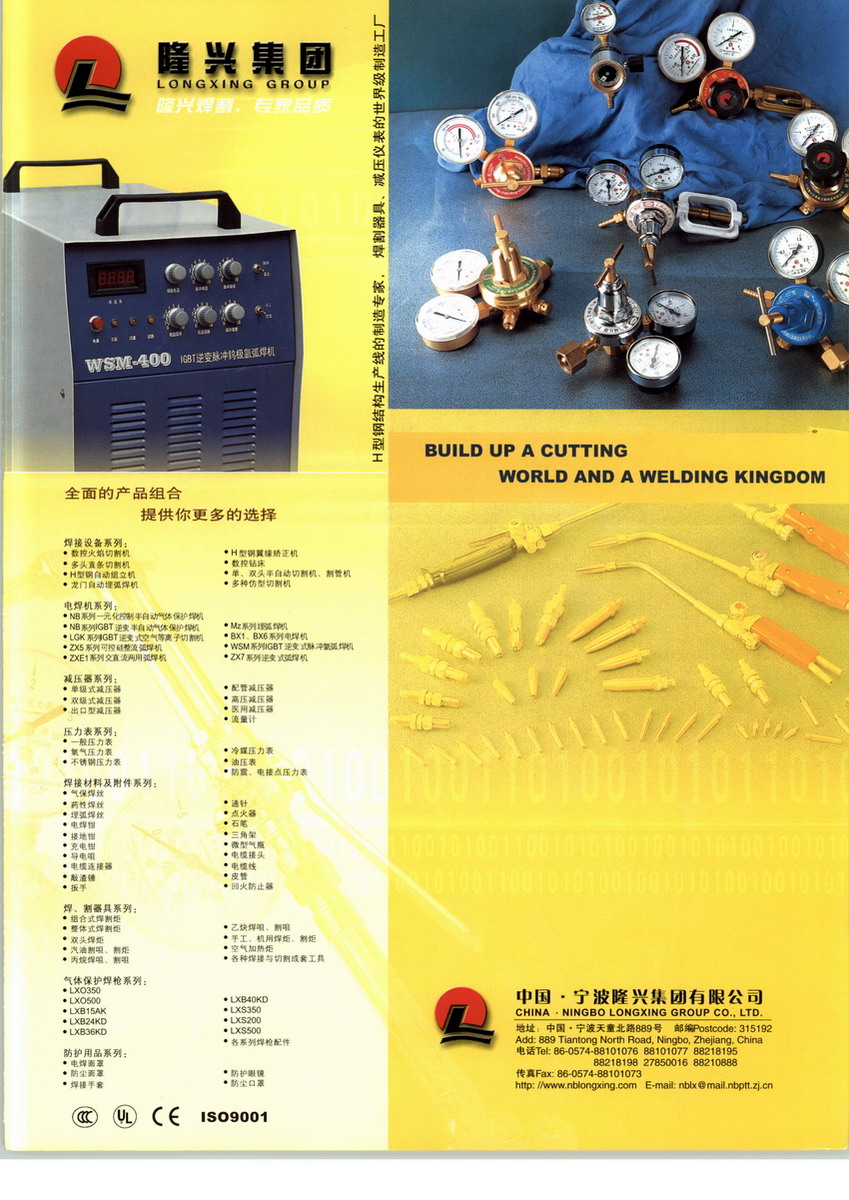 宁波隆兴集团有限公司座落在美丽的东海之滨——中国宁波,是一家专业从事焊割设备、焊割工具、焊接材料、压力仪表、减压器、数控机床与加工中心、H型钢生产线等多种系列产品的研发、生产与销售,并从事氧、氮、乙炔等工业用气体和太阳能硅片、太阳能电池片及太阳能光伏组件等系列产品的生产与销售,以及房地产开发的综合性集团公司。宁波隆兴集团有限公司拥有总资产10多亿元人民币,拥有一流的生产设备、试验与检测装备,工业用地280多亩,标准厂房10万余平米。公司现有在职人员1200余人,其中,中高级管理、技术人员150多人。公司1998年即通过了ISO9000质量管理体系认证。资源充足、配置科学、管理规范,已成为一支极具竞争力的经营实体。宁波隆兴集团生产的焊割器具一直以质优价廉、品种齐全著称焊割行业,早在1995年就被中国焊接协会评为名优产品,公司也因此成为中国焊接协会理事单位。隆兴牌氧气乙炔减压器以品质优、安全性能好,深得用户信赖,2001年即被评为宁波市名牌产品;隆兴牌焊割工具2009年被认定为浙江省名牌产品;“隆兴”商标2008年被认定为中国驰名商标;2011年隆兴牌焊割炬、焊割咀、压力表、减压器、流量计、电焊钳、焊丝和成套设备被评为“全国产品质量公正十佳品牌”;隆兴的“CCP”牌太阳能电池及其光伏组件以可靠的性能、稳定的质量赢得了国内外用户的高度评价,已大批量远销欧美;隆兴气体以其高品质、安全性强和超前的技术服务成为东南沿海多家大型船厂和钢结构公司指定供气单位;位于宁波市鄞州中心区嵩江中路518号的隆兴房地产代表力作“隆兴峰景苑”,集品质、地段、潜在价值和文化于一身,为宁波市的繁荣建设增光添彩。宁波隆兴集团有限公司本着“艰苦拼搏,诚信创新”的精神,致力于产品、服务品质的提升和品牌的打造,愿与社会各界人士携手共进,回报社会。