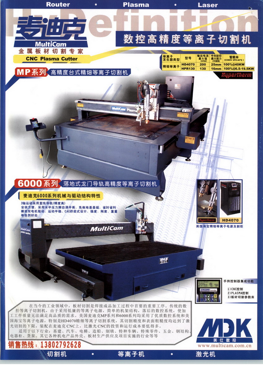 美国麦迪克致力于生产效率高、易于维护、经久耐用的数控龙门式板材加工中心,为客户提供专业的数控加工解决方案。至今已在全球安装了数以万计的设备; 并一直成功的在CNC领域保持着创新者的地位。美国麦迪克总部位于美国德州达拉斯,拥有108000平方英尺的厂房及14000平方英尺的技术演示和培训中心; 麦迪克将服务客户的理念贯穿全球,全世界拥有70多个销售及技术中心。在中国主要城市均设立了服务中心。坚持高标准使美国麦迪克(Multicam)在数控切割及加工领域一直是世界领先的品牌。麦迪克整机采用全钢架结构制造。主轴采用意大利知名品牌的高频电主轴,其具有结构紧凑、机械效率高、噪音低、振动小等特点。设备的生产工艺流程的每一个方面都得到很好的控制:从钢材切割到加工、焊接,从电气装配、安装到喷漆和最后的修整,都体现了产品质量的严格要求,对客户生产工艺细节的高度关注更一直贯穿其中,确保生产出品质始终如一,百分百满足客户要求的优良产品。美国麦迪克(Multicam)主要应用于: 非金属及轻金属板材高速异型及超大幅面加工,它是集合切割、铣削、雕刻、钻孔、开槽等与一体的高速数控加工中心, 优越的性能使麦迪克设备广受推崇,被誉为板材切割专家。美国麦迪克自1992 年进入中国市场,经过二十几年的时间累计客户数千家,特别是在航空/轨道交通/车辆行业的铝板加工领域里,享有极高的声誉。知名客户有:航空行业: 厦门太古飞机,西飞,江西昌河飞机,石飞,福建野马飞机,哈飞 等……车辆行业: 扬州麦斯通,中集集团,中美诺优,锐野专用车,常春专用车,中欧房车,骏通汽车,福田汽车 等……轨道交通行业: 常州奥通,长春冠信瑞达,南车南京浦镇车辆,江苏铁锚玻璃,株洲时代,长春普奥,常州长青集团,常州今创集团,青岛四方集团,沈飞机电 等……其他行业: 东芝电气集团,英中电气集团,上海加铝,博寿(天津)冶金设备制造,沈阳远大集团,北京江河幕墙,上海加铝 等……MultiCam 还拥有一支经验丰富、训练有素的稳定的工程师队伍,他们是机械、电子、计算机软硬件方面的高素质专业人才,并经常接受来自美国总厂的先进技术的培训,随时准备为全中国及亚洲地区的MultiCam 客户提供世界领先的切割、铣削等技术服务。我们关注客户加工工艺及流程的每个细节,为客户提供专业的加工解决方案。"品质第一,客户至上" 是上海鼎迪数控设备有限公司的一贯宗旨。全天候咨询电话(021-57632619 手机:18116341319), 给予您强大的保障。