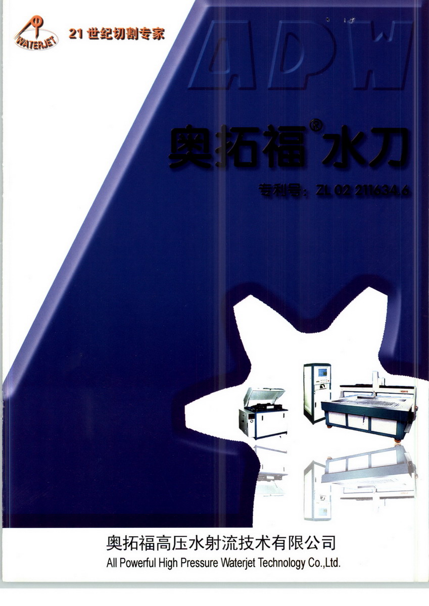 沈阳奥拓福高压水射流技术有限公司是专业从事超高压水射流切割设备制造及耗材、配件销售的高新技术企业。沈阳奥拓福高压水射流技术有限公司自行研制生产的数控万能超高压水射流切割机--奥拓福"AP系列水刀",在金属和非金属加工领载有着其他加工方法无可比拟的优势。其造型、结构、工艺均属国内一流水平,是集机电液一体化典型高科技产品,由计算机控制的切割平台和超高压发生器组成的也切割设备可以切割任意复杂平面图形。该产品具有技术先进,整体系统稳定,切割精度高,受压元件使用寿命长,易损件更换容易,切割成本低等特点,倍受国内外客户的青睐。设备特点节省工作时间及使用工夹具的成本;用同一种机器即可完成钻孔及切割功能,降低切割成本;不产生热效应或变形或细微的裂缝,不需二次加工,可节省时间及制造成本;不产生有毒气体,为操作人员提供更健康的工作环境;切口光滑,一次即可完成工件之切割且拥有良好的切边品质,可达到半精加工水平,工件粗糙度可达6.3μm,如果加工半精加工零件,切割后无需后道工序降低成本;切缝窄,可减少大量废弃材料的产生,节省直接制造成本;根据设计及工件材质的不同,可以非常方便、快捷的进行调整,缩短从接单至成品产出的时间,为您的企业带来更多的商机和利润。产品应用范围极其广泛如:玻璃、石材、建筑陶瓷、黑色金属、有色金属、纸张、要板、布匹、皮革、橡胶、复合材料、海绵等,几乎包括所有能想象的一切材料。而且该产品切割速度快、切缝窄、切口光滑、无热变形、加工成本低,正日益广泛的应用在军工、航天、航空、船舶、汽车、制衣、电子、建筑、广告等行业中,这是一种绿色无污染的高新技术产品。技术参数平台有效工作行程: 1300×1300×150(mm)结构形式:龙门移动式数控系统:步进系统切割功能:任意平面曲线切割精度:±0.1mm重复定位精度:±0.02mm最大压力:300Mpa使用压力〈300Mpa增压比:19:1可用水喷嘴最大直径:0.3mm电压:380V/5OHz连续工作:24小时。