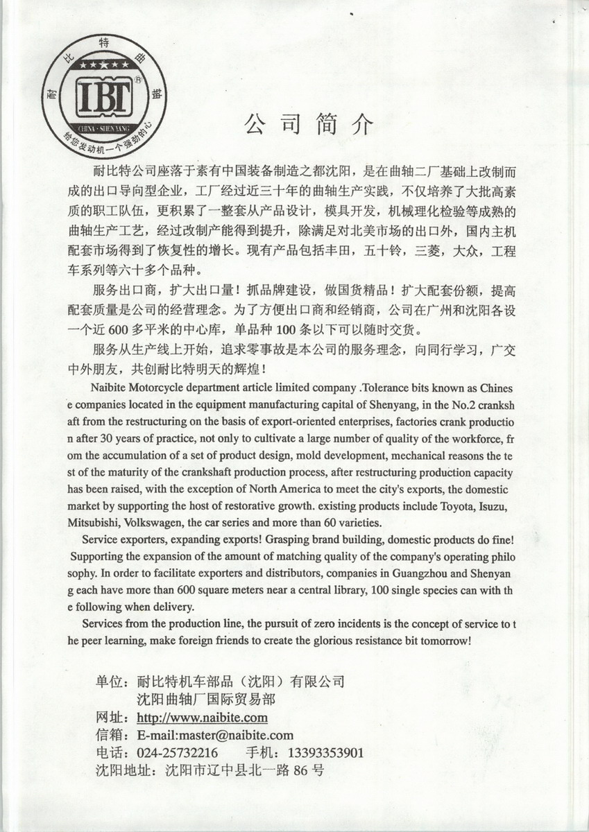 耐比特公司座落于素有中国装备制造之都的沈阳,为了方便新老客户在广州设立一个总销售中心。沈阳耐比特机车部有限公司是一家集生产加工、经销批发的有限责任公司,五十铃曲轴、三菱曲轴、丰田曲轴、工程机械曲轴、马自达曲轴、五十铃缸套、三菱缸套、叉车缸套、工程机缸套、三菱缸盖、缸套组件、气门大全是沈阳耐比特机车部有限公司广州分公司的主营产品。沈阳耐比特机车部有限公司广州分公司是一家经国家相关部门批准注册的企业。沈阳耐比特机车部有限公司广州分公司以雄厚的实力、合理的价格、优良的服务与多家企业建立了长期的合作关系。沈阳耐比特机车部有限公司广州分公司热诚欢迎各界前来参观、考察、洽谈业务。