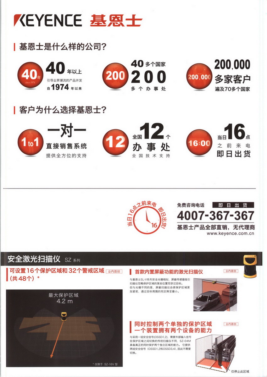 基恩士(中国)有限 公司, 以下简称基恩士。在2001年9月设立了第一个销售网点。现在在上海、北京、天津、大连、青岛、深圳、香港等国内首要城市设立了办事处。我们的创新产品不仅能够满足许多制造与研究行业客户现在的需求,而且还能够满足它们将来的需求。在基恩士,我们致力于预见市场的未来发展,在现阶段提供对应未来需求的方案。在基恩士 ,我们并不满足于仅仅拥有市场上的优秀产品,我们还为客户提供更丰富的业界知识及更专业的技术方案。我们致力于为客户成为行业领先者提供支持。基恩士属蓝筹公司,已得到许多著名机构的认可。最近,我们在《福布斯》杂志的“全球最具创新力公司”排行榜中位列第 17。 我们也是《商业周刊》(Business Week) 的“1000 家最有价值公司”之一,并且 在日本《日经新闻》的“日本十佳公司”年度榜单中。今天,基恩士为世界范围内约 100 个国家 或地区的 20 余万家客户提供服务,基恩士这个名称意味着创新与卓越。