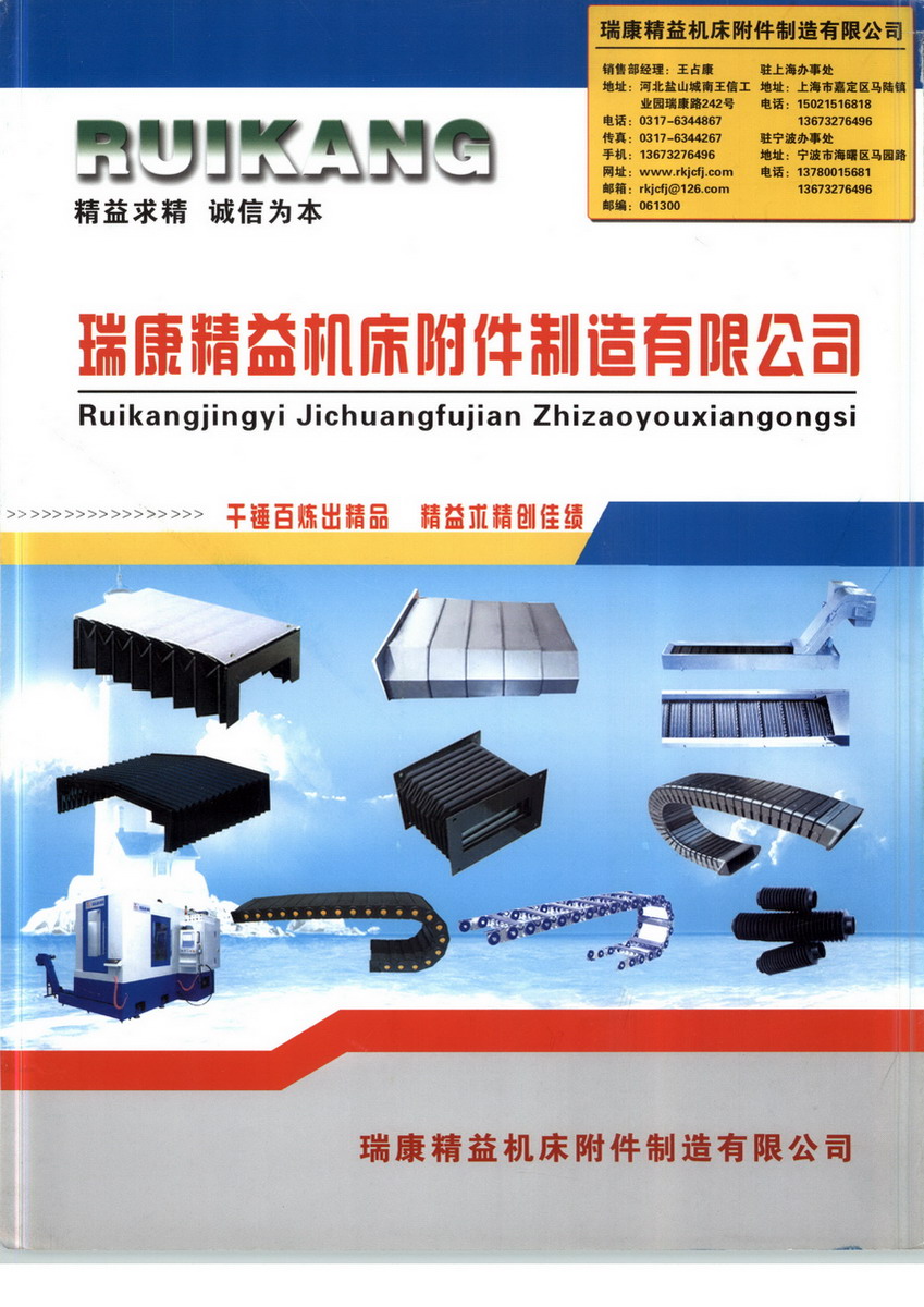 瑞康精益机床附件制造有限公司生产制造各种机床附件产品包括拖链、塑料拖链、工程塑料拖链、钢制拖链、不锈钢拖链、防护罩、风琴罩、卷帘护罩、导轨式防护罩、风琴式防护罩、柔性风琴式防护罩、不锈钢防护罩、排屑机、冷却管、垫铁、金属软管、导管护套、工作灯、软管和接头等系列产品。我公司十几年来秉承“信誉至上,用户”的经营宗旨,始终坚持“对用户服务全方位,让用户使用更经济”的服务理念,拥有雄厚的技术力量和齐全的检测的手段,完整的质保体系,建立了高效的技术保障体系和售后服务网络,从而保证我们生产销售的每一件产品在同行业中具有较高的性能价格比,倍受中外客户的青睐。科学的管理,成熟的生产技术,完备的生产工艺,健全的质保体系,保证了公司的产品的高品质和完善的技术跟踪服。