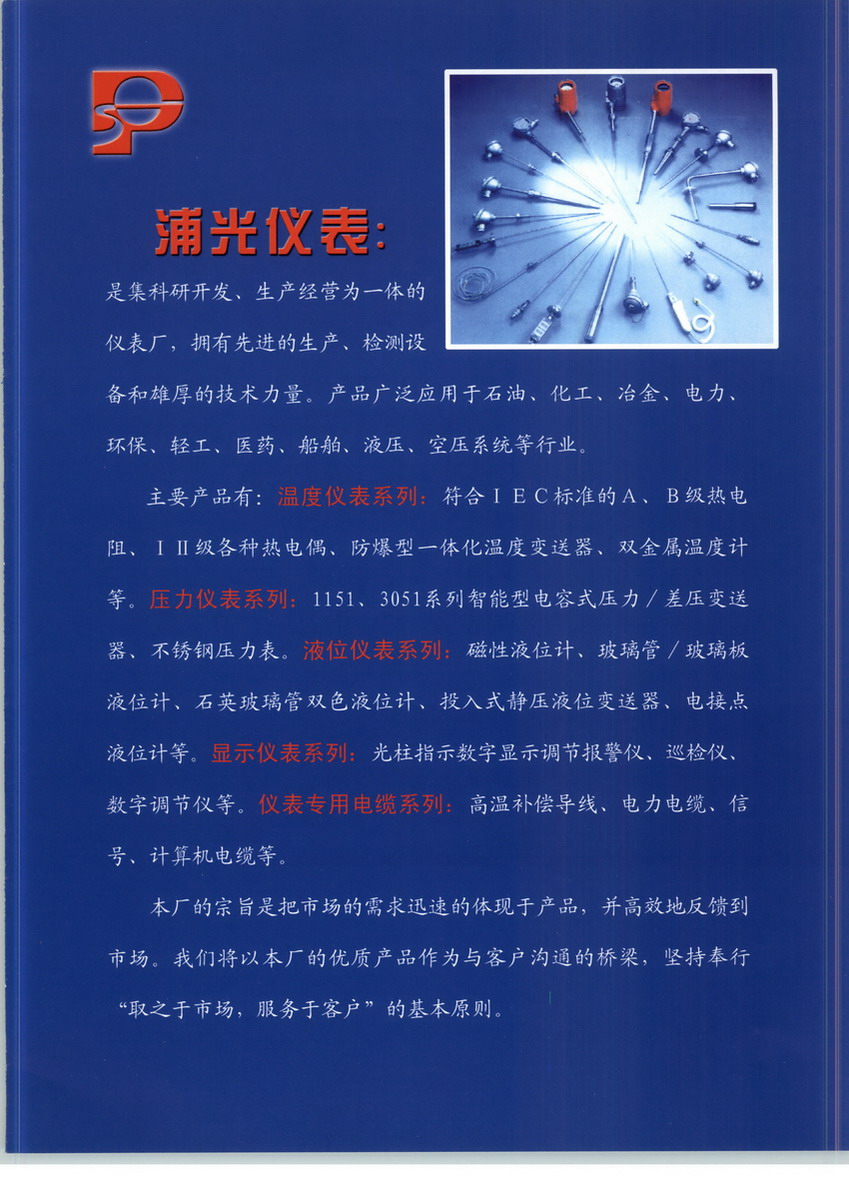 上海浦光仪表厂创建于1993年,是国内较早从事自动化仪表研发生产的专业厂家,可为用户提供系统设计、技术咨询、工程成套、安装指导、运行调试、维修服务等一条龙服务。 工厂位于上海市虹口区梧州路374号,交通便捷。工厂系高新技术企业,技术力量雄厚、生产检测设备先进,制造工艺精良,已通过ISO9000质量体系认证,使产品质量得到有力保证。产品厂泛应用于航天、军工、电力、化工、石化、环保、市政、建筑、冶金、制药、食品、水处理等行业。工厂也成为中石化、中石油定点企业,同时也是全国化工企业推荐的合格仪器仪表供应方。 本厂研制、开发、生产的产品涉及六大系列、400多个品种。温度仪表系列:符合IEC标准的A、B级热电阻、Ⅰ、Ⅱ级各种热电偶、防爆型一体化智能温度变送器等;压力、差压仪表系列:普通压力/差压变送器、智能型电容式压力/差压变送器等;液位仪表系列:玻璃管/玻璃板液位计、磁性液位计、石英玻璃管双色液位计、电接点液位计、投入式静压液位变送器、电浮筒液位变送器等:流量仪表系列 :全中文智能涡街流量计、全中文智能涡轮流量计、流量积算仪等;显示仪表系列:光柱指示数字显示调节报警仪、智能型数字调节仪表等;仪表专用电缆系列:高温补偿导线、RV、BV系列聚氯乙烯屏蔽电缆、KV系列交联阻燃、电力电缆,信号、计算机电缆等。 工厂自成立以来一直秉承“诚实守信、精益求精、服务第一、客户至上”,的理念,坚持“以人为本、以品牌为目标、以市场为导向,以服务为生命,以品牌为目标,以管理为保证”的经营哲学,竭诚为客户提供一流的产品和一流的服务。浦光愿作您永远的朋友,与您携手共享成功!