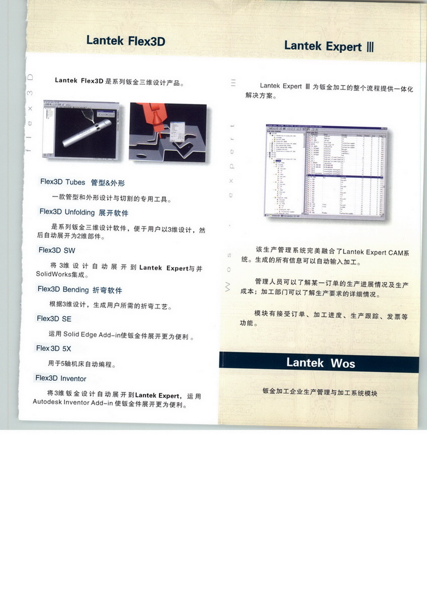西班牙Lantek公司是钣金行业软件供应商,其产品线包括CAD/CAM/PDM/ CRM/ERP。钣金的解决方案包括冲、切、折、复合机床编程,三维部件设计和展开,管料和表面切割,折弯编程等。Lantek 范围内和主要厂商长期合作,其中包括LVD、Euromac、Hankwang等。为方便客户,我们与主流CAD软件供应商合作,包括SolidEdge、SolidWorks、Inventor等。 Lantek成立于1986年,经过20多年的不断努力: 销售额及市场占有率欧洲** 研发人员及软件升级研发投入业14个国家拥有分公司 支持16 种语言 五大洲约有7000家客户,包括EROMAC、LVD、西门子、丰田、韩光,大连机床厂等 为更好地服务中国区用户,Lantek 在2006年成立中国分公司,目前在广州和上海设有服务机构。公司产品主要分为两块,CAD/CAM和钣金工厂**ERP CAD部分分为二维设计,三维设计/展开,空调风管设计等 CAM软件是一种通用CAM软件,兼容上绝大多数的冲/切/复合设备。 ERP可以给用户带来生产排班,员工培训,生产管理,减少重复劳动等等便利。