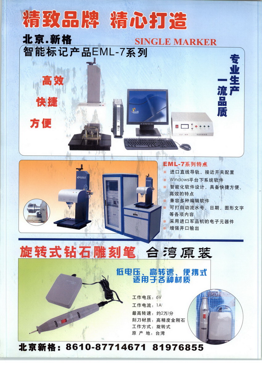 我公司位于繁华的北京市朝阳区的中心地带。公司主要人员均长期专业从事打标机行业工作,同时聘请台湾高级专业技术顾问,他们有着丰富的实践经验与精湛的专业技术知识。长期致力于各类标识机械的研究与开发等系列工作,使得新格永发公司始终站在行业的前列,始终保持着先进科学的积极响应者的姿态,不断地在成长中更新和发展自己;“新格”牌系列产品博众家之长,创独家之特色,始终保持着独特的经营模式与设计能力,以绿色环保为理念,将先进性、科学性、实用性融为一体,不断地推陈出新,为广大客户研制出了更多的质优价廉的绿色环保、无噪声高科技产品,以满足更多的客户需要。客户是上帝,质量是生命,服务是灵魂,是我们永远信奉的格言,同时也是我们新格公司每一位员工一切行动的宗旨。我们将以我们的真诚信用回报每一位客户,保证他们实现最大的利益与回报,希望通过我们的产品和我们的服务,能感受到新格的真诚奉献,希望更多的客户能够由此而得到更多的收益。我公司生产销售各型号打标产品及台湾原产气动工具,包括:新格牌半导体激光打标机,新格二氧化碳激光打标机,新格气动打标机,新格金属电化打标机、铭牌刻字机、压字机,流水线专用号码机,冲床专用号码机,台湾原装进口攻丝机,台湾原装进口气动攻丝马达,悬臂式支架,国产电动刻字笔,原装进口电刻笔、WE251型可调速度电动雕刻笔,气动起子,气动扳手、台湾原产气动刻字笔,原装进口修磨工具、工业级刀具研磨机,铣刀研磨机,钻头研磨机,侧刃研磨机,球刀研磨机,各类扭力工具,扭力起子,扭力测试仪,扭力计,推拉力计,推拉力测试仪,张力计,气动剪刀头,气动剪,专业定做各类不锈钢,铜,铝腐蚀铭牌,激光打标加工,气动标记加工等各类产品,欢迎各类新老客户来电来信询洽。