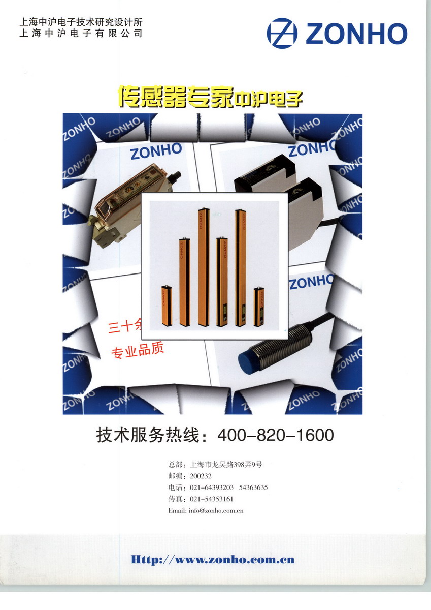 中沪电子从创业至今已有二十多年的历史,中沪诞生的背景之一就是西方对中国高科技产品的禁运,老一辈中沪人一以顽强的毅力,勇往直前的气概和勇于为科学献身的精神,在各方支持下几经风雨,诞生了第一批应用于航天、军工产品的光电传感器。今天,新一代中沪人一方面秉承老一辈中沪人知难而上,勇于攻关的创业精神,一方面积极学习先进的技术、管理、营销知识,不断进取,成长为业界的佼佼者,ZONHO中沪电子也成为业界最知名的品牌之一。集二十多年专业研究、开发、生产之经验,中沪电子各种系列的光电开关、接近开关、光纤传感器、标志传感器、光幕传感器、数字式计时计数器、转速表,以其卓越的性能、稳定的品质、实惠的价格及良好的服务,赢得了越来越多客户的信赖和钟爱。新一代产品采用了ASIC电路,SMT工艺和数字化技术,并采用CAD/CAM电脑辅助设计/制造系统以及严格按照ISO9001标准建立了全面质量管理保证体系,并且始终处于受控运行状态,以确保产品性能和质量在业内的领先地位。中沪电子产品被广泛应用于航空航天、航海、铁路、邮电、通信、电梯、纺织、石油化工、矿山、冶金、机床、烟草、包装、印刷、食品、计量、办公、家电等行业,其中200家以上的航空航天和军工企业采用了中沪电子产品作为配套,亦有5000家以上的工厂使用中沪电子产品,并且产品已销往美国、新加坡、香港、泰国、台湾、马来西亚、巴基斯坦及中东、非洲等国家和地区。 如今,从大众的生产流水线到装甲车的测速装置,从隧道挖掘设备到纽扣检测定位,从翱翔太空的航天器到夜上海街头的广告灯箱,都有中沪的产品在发挥着不可估量的作用,甚至于第一代产品如今还在数以万计的设备和仪器上正常运行着。这就是中沪人对产品的理解,对自动化专业的贡献,也是中沪存在和不断发展的真理。主要产品:各种系列的光电开关、接近开关、标志传感器、光纤传感器、安全光幕传感器,切纸机安全光栅装置,冲床安全光幕,数字式计时器,时间继电器,电子计数器,转速表,电子计长仪,传感控制器,固态继电器,智能数显调节仪,稳压电源等工控产品。
