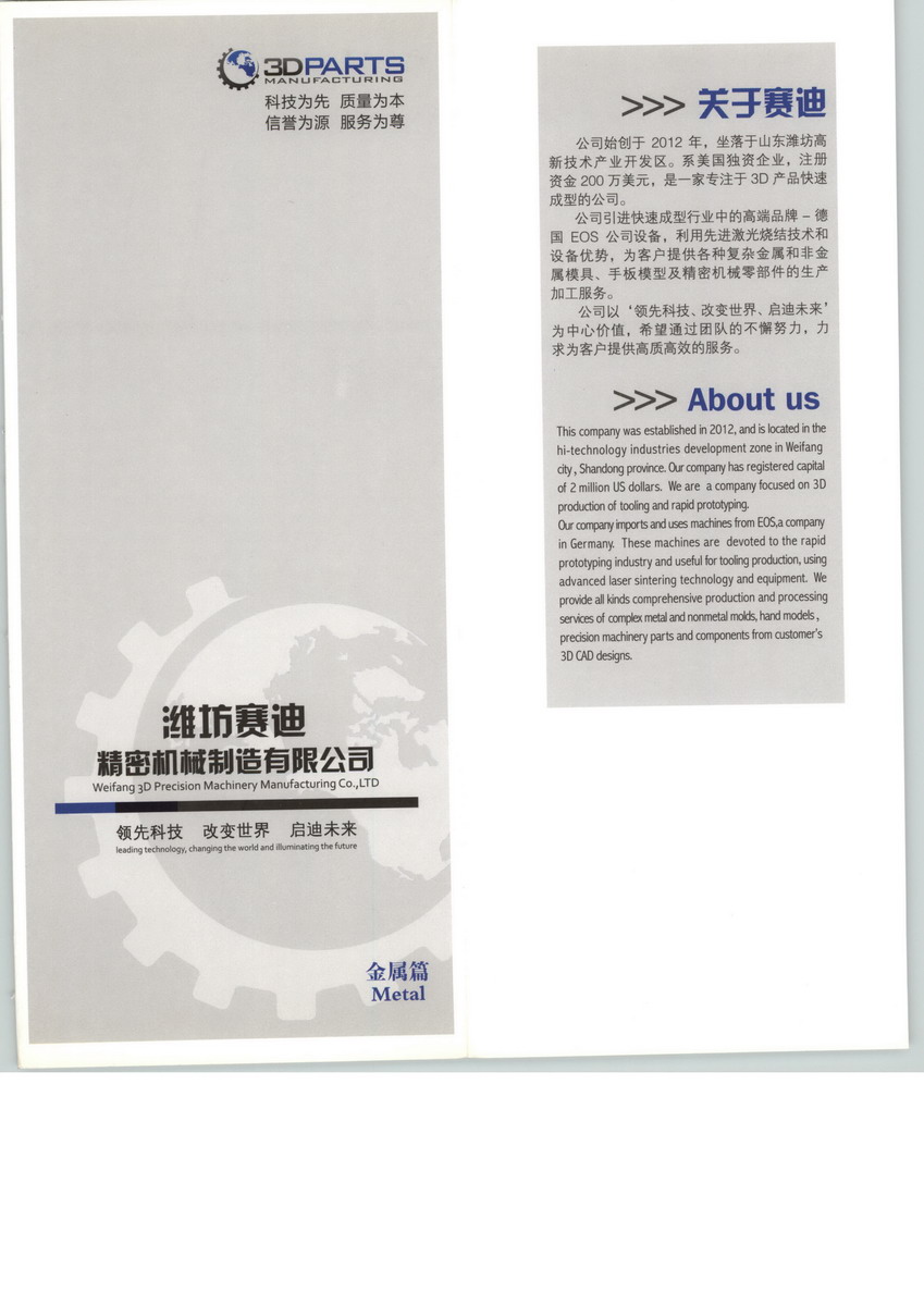 潍坊赛迪三维科技股份有限公司始创于2013年,注册资金1100万元,坐落在中国潍坊高新产业开发区3D打印技术创新服务中心,是一家专注于提供三维扫描、数据建模辅助设计、小批量手板模型加工、个性化定制及设计验证后量产服务等综合方案服务的高新技术企业。公司目前引进快速成型行业中的高端品牌-德国EOSM280、P395、EnvisionTEC以及美 国 3 D s y s t e m 、Stratasys、Renishaw等国际知名品牌的顶尖装备阵容,同时整合行业相关设备资源,如:华曙HK500、蓝光扫描、石膏全彩projet660、Projet3500、Projet3510HD、ultra3sp、、数字化无模铸造精密成型机、数字化消失模铸造精密成型等,涉及DMLS、SLS、SLA、DLP、 PolyJet、FDM等全系列3D打印及真空硅胶注模等传统成型方式,充分满足航空、医疗、光电、教育科研、工艺设计、汽车等诸多领域对金属和非金属,单色和多色等多重要求的生产加工服务。公司以“领先科技、改变世界、启迪未来”为中心价值,希望通过团队的不懈努力,引领中国3D打印行业发展风尚,普及3D打印技术,为客户降低产品研发创新成本,缩短创新研发周期,简化制作以提高产品质量与性能,提升我国创新能力,真正实现从“中国制造”走向“中国创造”!