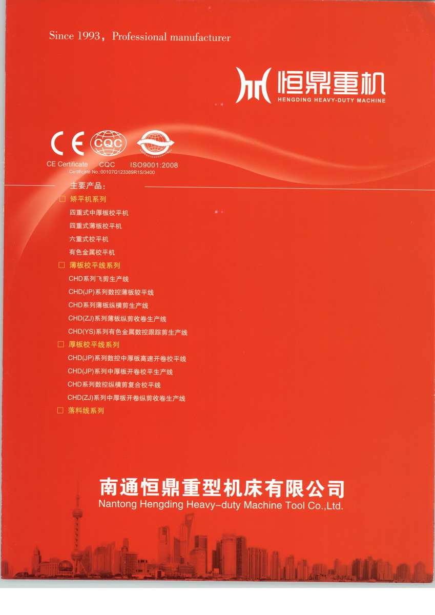 江苏恒鼎机床有限公司(原南通恒鼎重型机床有限公司)位于万里长江入海口的北岸平原,是一家集科研开发、制造销售于一体的金属板料加工类机械的专业生产型企业。主要为客户提供系列板料校平机及厚板、中板、薄板卷材的开卷、校平、横切、纵切、码垛、收卷生产线。在致力于开卷校平设备研发生产的同时,我们不断探索新的产品领域。开发出与主导产品相配套的更新系列液压机、剪板机、折弯机、卷板机等机床产品,最大可能地满足客户多元化需求。产品广泛适用于冶金、船舶、机械、车辆、容器、建材、化工、航空、能源、建筑等行业。积跬步以跃千里,聚小成终铸大器。公司自创建以来,不断地汲取国内外先进的技术、工艺,追求产品技术新颖、性能卓越,相应产品其技术先进性在国际、国内同行业中居领先水平。恒为久,鼎为信!在全球经济一体化的今天,恒鼎人牢记中华民族树信立身的古训,坚持“践诺永恒、珍誉如鼎”的企业理念,踏实创造,努力为客户提供优质的产品,诚信的服务。 恒久信,鼎盛兴!我们与时俱进、不断创新。永远年轻的恒鼎人愿与关心我们的社会各界朋友共携手、共成长、共繁荣,共辉煌!